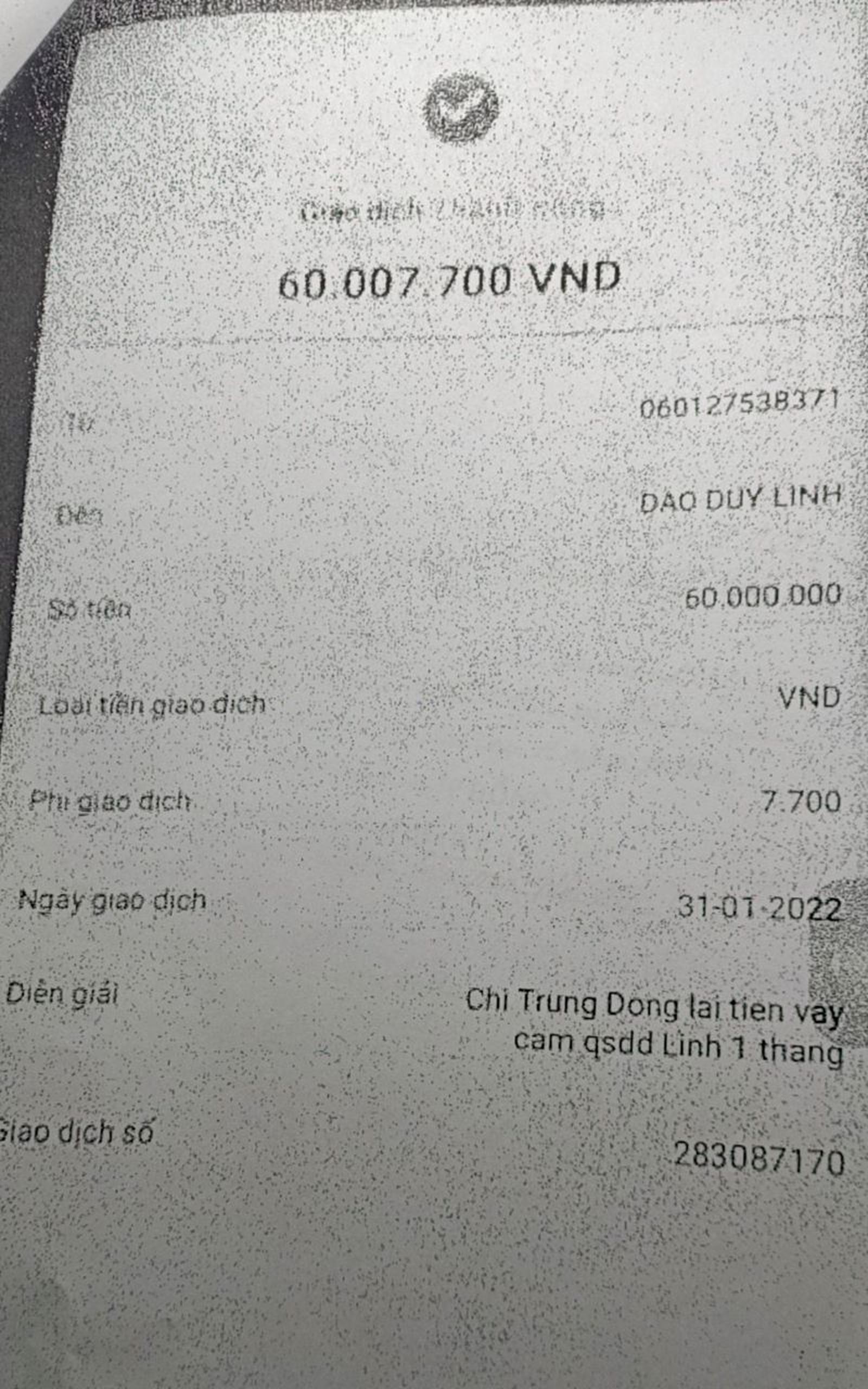 Ông Trung cho biết, ngay khi nhận số tiền 600 triệu trên, bà Phúc và ông Linh đã thu ngay số tiền lãi tháng đầu là 60 triệu đồng. Đều đặn các tháng sau đó, nhóm bà Phúc và ông Linh tới thu tiền lãi bằng tiền mặt. Chỉ có tháng 1/2022 là ông Trung chuyển khoản qua tài khoản ngân hàng cho nhóm bà Phúc theo số tài khoản của ông Linh (Đào Duy Linh) số tiền 60 triệu đồng (biên lai chuyển khoản đã thể hiện rõ nội dung: "Chí Trung (ông Nguyễn Chí Trung) đóng lãi tiền vay cầm quyền sử dụng đất Linh (Đào Duy Linh) 1 tháng".