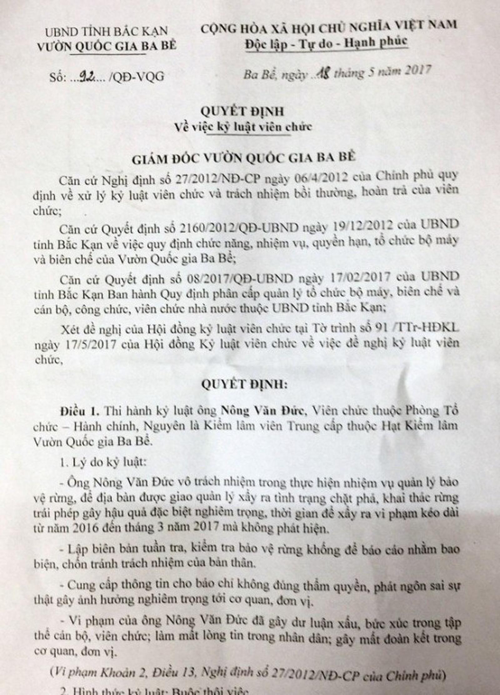 Ngày 18/5/2017, VQG Ba Bể đã có Quyết định số 92 về việc thi hành kỷ luật buộc thôi việc đối với viên chức kiểm lâm Nông Văn Đức vì lý do: Ông Nông Văn Đức vô trách nhiệm trong thực hiện nhiệm vụ quản lý, bảo vệ rừng, để địa bàn được giao quản lý xảy ra tình trạng chặt phá, khai thác rừng trái phép gây hậu quả đặc biệt nghiêm trọng, thời gian để xảy ra vi phạm kéo dài từ năm 2016 đến tháng 3 năm 2017 mà không phát hiện.