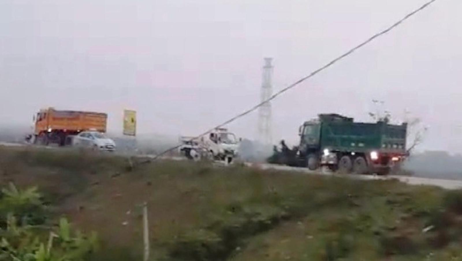 Tình trạng xe có tải trọng lớn chở vật liệu xây dựng quần thảo trên tuyến đê tả sông Hồng diễn ra thường xuyên nhưng chưa được xử lý dứt điểm (Ảnh cắt từ clip do phóng viên ghi lại)