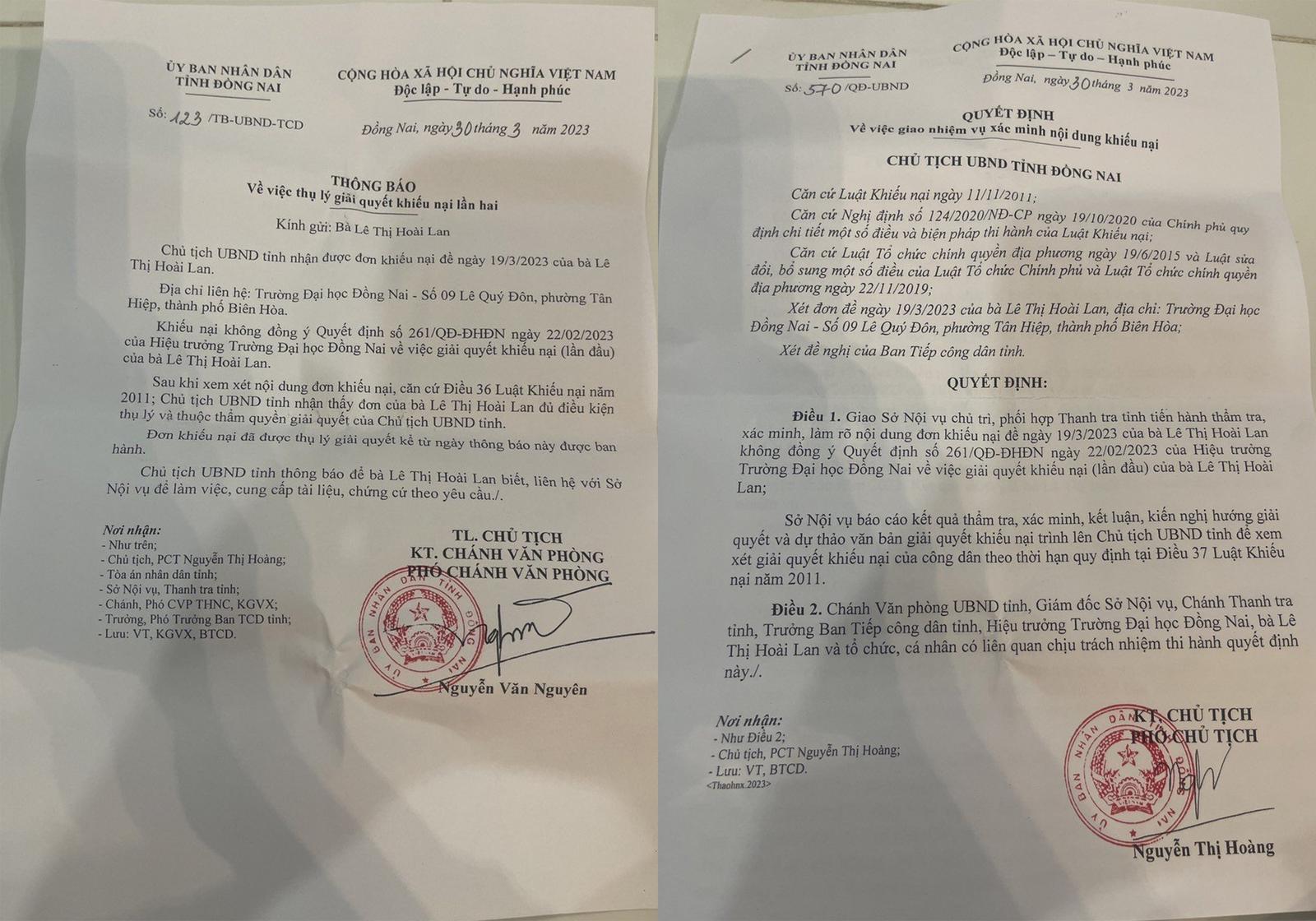Liên quan đến vụ việc, ngày 30/3/2023, Chủ tịch UBND tỉnh Đồng Nai đã có Thông báo số 123/TB-UBND-TCD về việc thụ lý nội dung đơn thư khiếu nại của bà Lê Thị Hoài Lan, khiếu nại các quyết định kỷ luật đối với bà của Trường Đại học Đồng Nai. “Chủ tịch UBND tỉnh Đồng Nai thông báo để bà Lê Thị Hoài Lan biết, liên hệ với Sở Nội vụ để làm việc, cung cấp tài liệu, chứng cứ theo yêu cầu”, Thông báo số 123/TB-UBND-TCD nêu rõ.