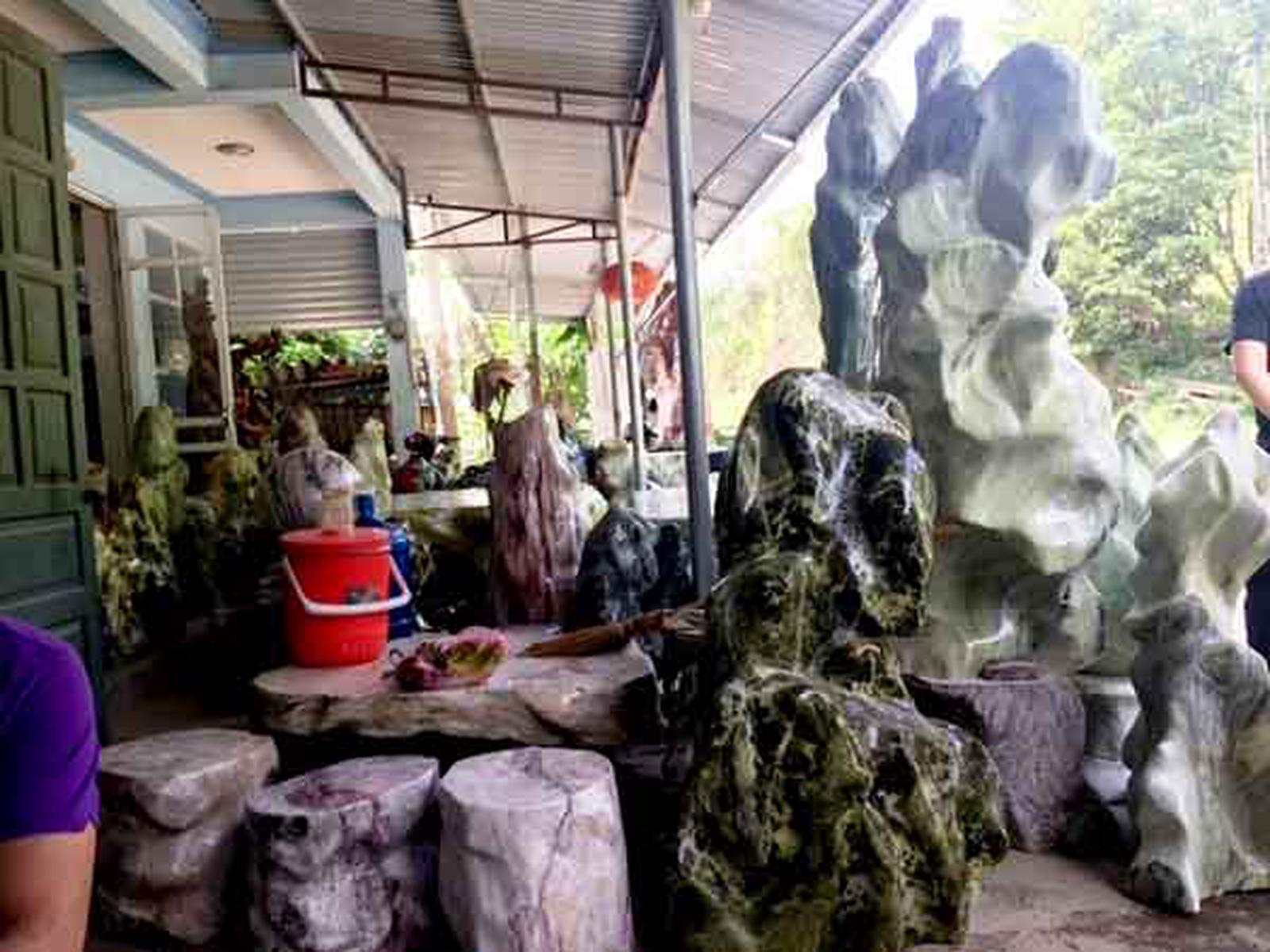 Chia sẻ với chúng tôi (trong vai người đi mua đồ đá mỹ nghệ), ông T - chủ đá kinh doanh đá lớn nhất Văn Chấn cho biết, cả 2 cửa hàng của ông tài sản khoảng vài chục tỷ đồng. Đây là sản phẩm ông thu gom trong nhiều năm, kể từ khi ông còn là công chức Nhà nước (ông T nguyên là cán bộ công an). Tất cả các dòng sản phẩm mỹ nghệ từ đá, ông T đều đáp ứng được hết, thậm chí nhiều sản phẩm là quà biếu “độc” cũng đều từ cửa hàng của ông xuất đi. “Nói thật là việc khai thác đá ở đây bị cấm, chưa được cấp phép vì đá ở khu vực Suối Giàng là đá bán quý, cần phải được cấp phép. Bao nhiêu năm nay dân vẫn làm và nhiều người giàu lên nhờ khai thác đá thổ phỉ”…