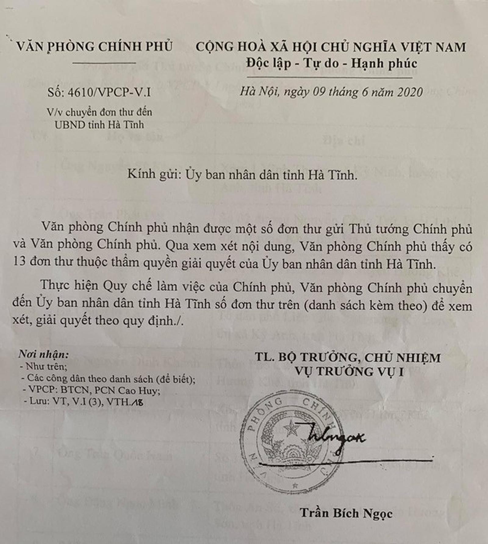 Mới đây, ngày 9/6/2020, Văn phòng Chính phủ tiếp tục có Văn bản số 4610/VPCP-V.I về việc chuyển đơn thư của bà Nguyễn Thị Châu và 12 công dân có đơn khác gửi UBND tỉnh Hà Tĩnh.