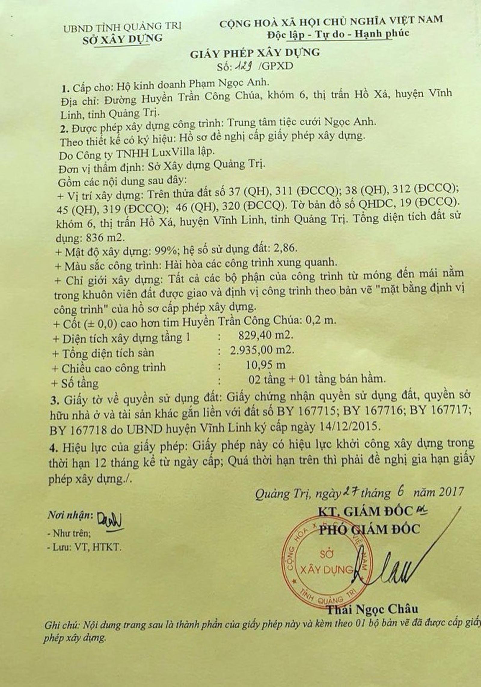Giấy phép xây dựng thể hiện Trung tâm Tiệc cưới Ngọc Anh xây dựng tại thị trấn Hồ Xá (huyện Vĩnh Linh, tỉnh Quảng Trị) vào năm 2017. Ảnh: Minh Tân