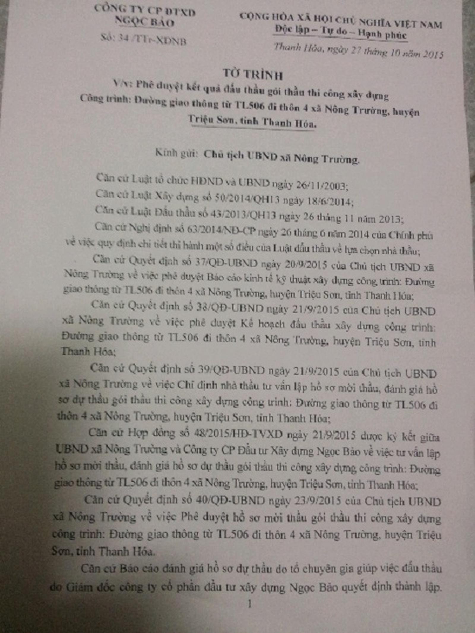 Tờ trình của Công ty Ngọc Bảo kiến nghị UBND xã Nông Trường cho đấu thầu lại, nhưng mọi việc sau đó lại được chỉ định thầu trái luật. Ảnh: Văn Thanh