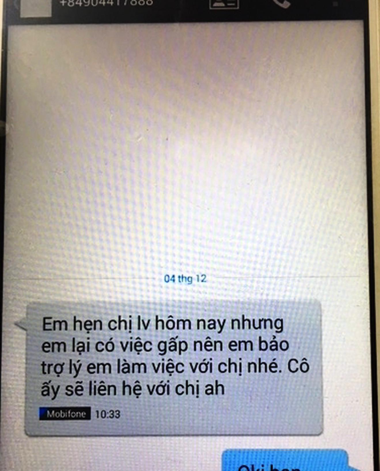 Đến lịch hẹn, bà tiếp tục nhắn tin cho biết mình bận, trợ lý sẽ liên lạc lại.