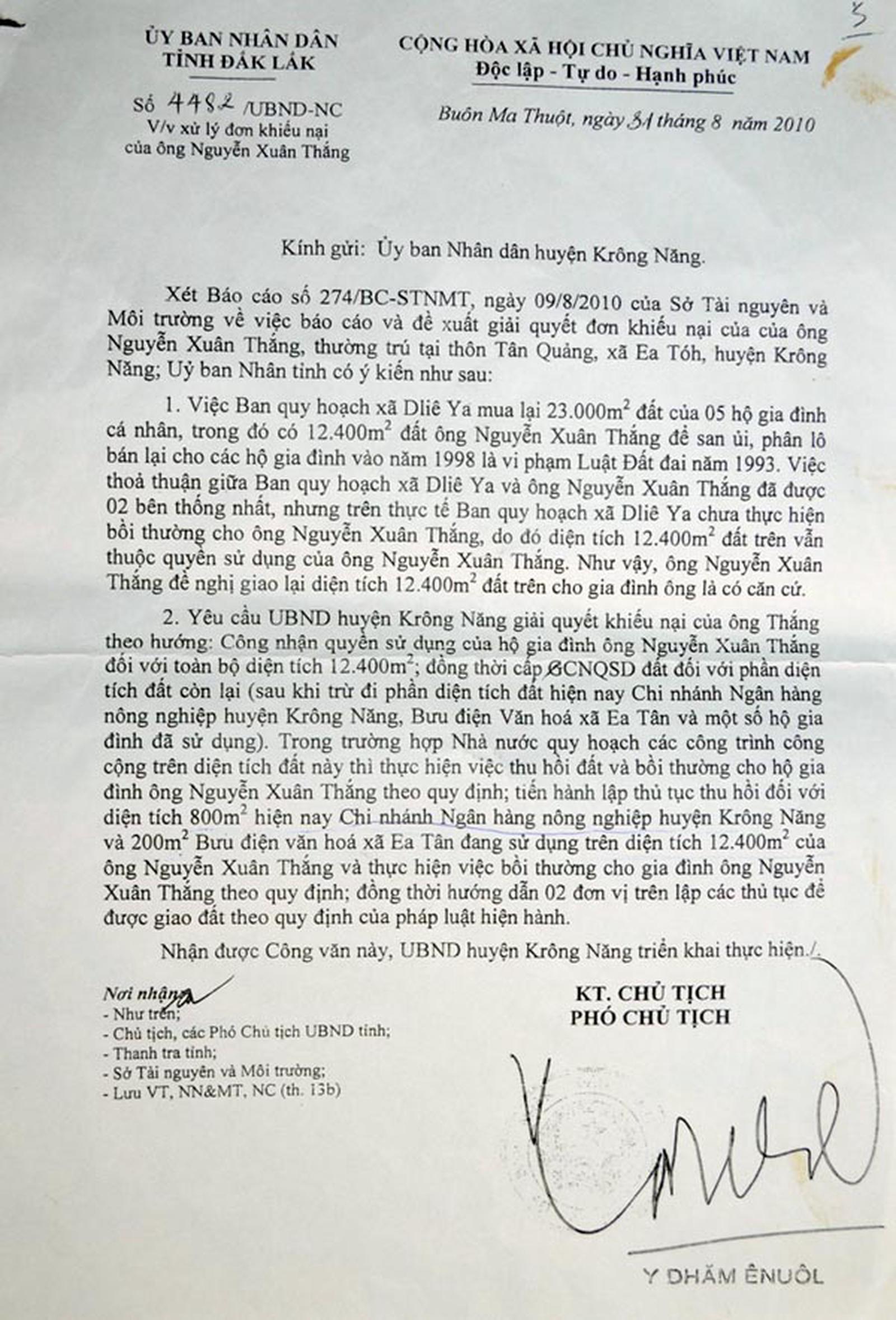 Sau 12 năm nỗ lực đòi lại đất, ngày 31/8/2010, UBND tỉnh có Công văn số 4482/UBND-NC nêu rõ: Trên thực tế, BQH khu vực Bãi Bằng chưa thực hiện bồi thường cho ông Nguyễn Xuân Thắng, do đó, diện tích 12.400m2 vẫn thuộc quyền sử dụng của ông Thắng. Yêu cầu, UBND huyện Krông Năng công nhận quyền SDĐ của hộ gia đình ông Nguyễn Xuân Thắng đối với toàn bộ diện tích 12.400m2. Thực hiện việc thu hồi và bồi thường cho gia đình ông Thắng theo quy định đối với phần diện tích Chi nhánh Ngân hàng Nông nghiệp và Phát triển nông thôn (NN&PTNT) huyện Krông Năng, bưu điện văn hóa xã và một số hộ gia đình đã sử dụng. Đồng thời, cấp giấy chứng nhận quyền (GCNQ) SDĐ cho gia đình ông Thắng trên phần diện tích đất còn lại.