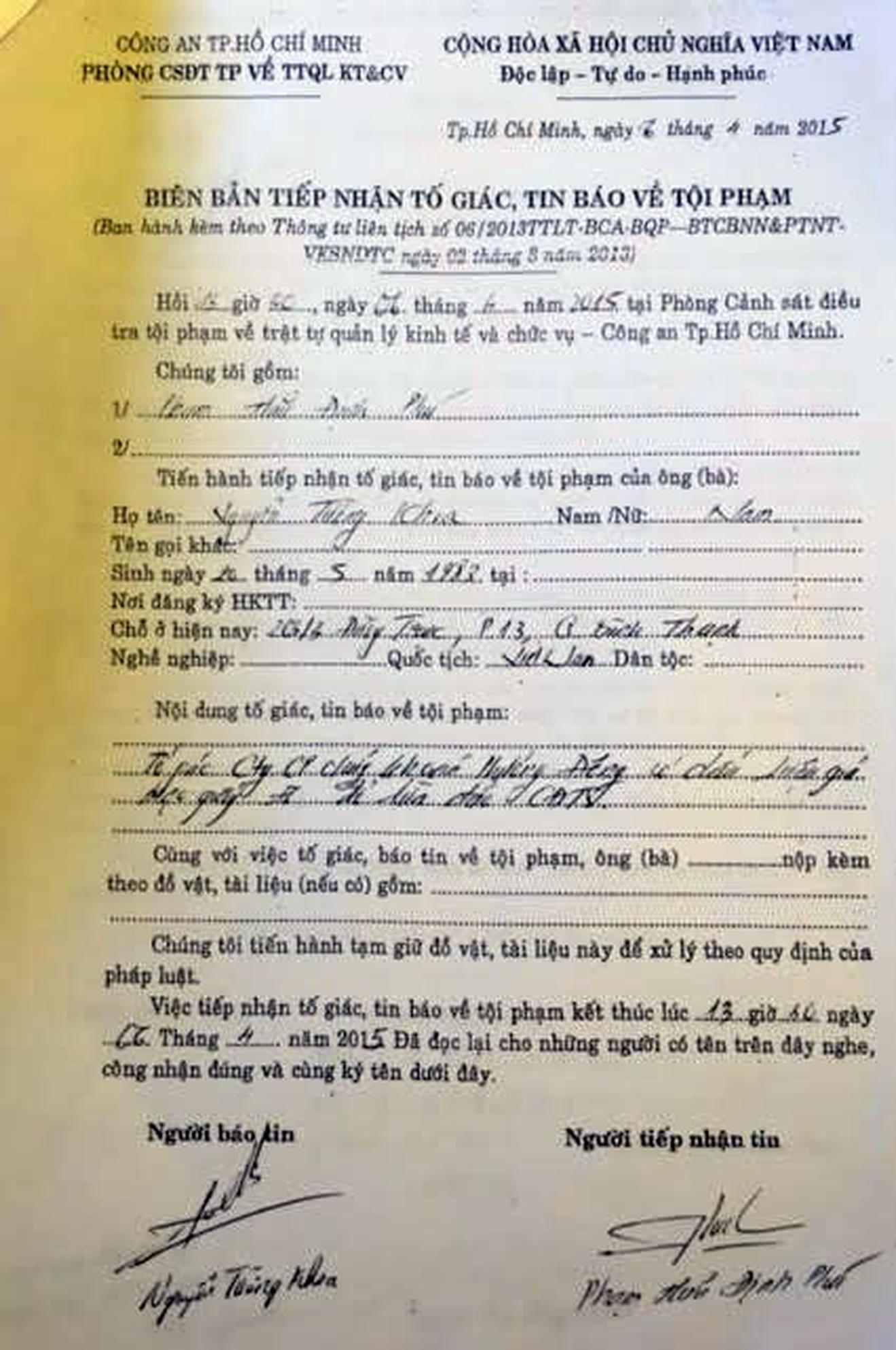 Phải chăng đã có sự cấu kết giữa các cá nhân trong Công ty Phương Đông để cùng nhau gian dối, ngụy tạo giấy tờ thực hiện những hành vi phạm pháp luật nhằm chiếm đoạt tài sản của ông Dự? Để đi tìm lời giải cho câu hỏi này, ngày 6/4/2015, ông Khoa đã làm đơn đến Cơ quan Cảnh sát điều tra về trật tự quản lý kinh tế - chức vụ Công an TP HCM. Cơ quan này đã lập biên bản tiếp nhận tố giác, tin báo về tội phạm.