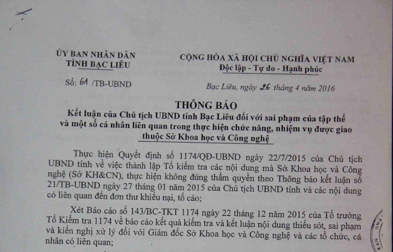 Thông báo Kết luận của Chủ tịch UBND tỉnh về những vi phạm tại Sở KHCN tỉnh Bạc Liêu. Ảnh: Chu Tuấn