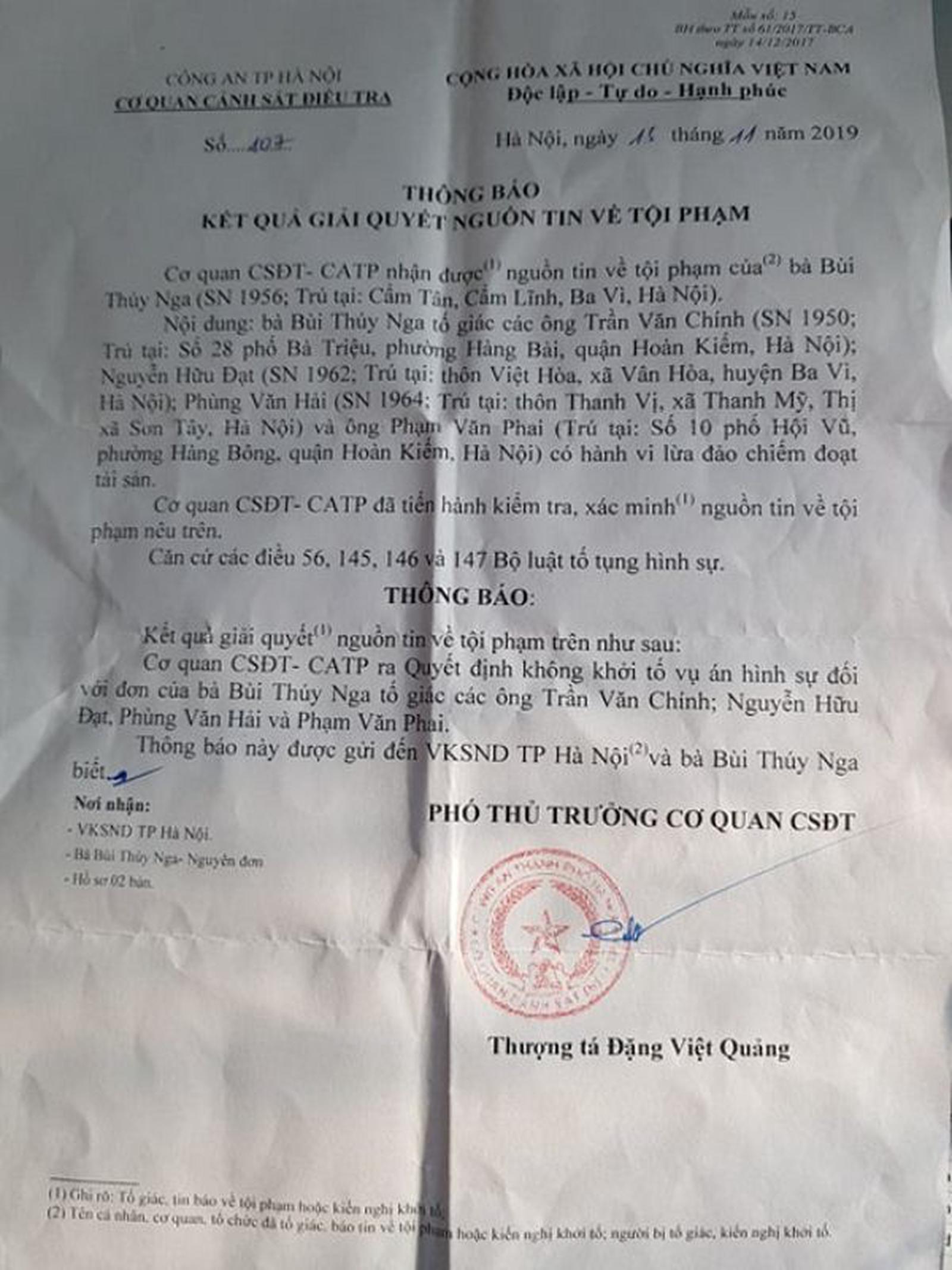 Cơ quan CSĐT, Công an TP Hà Nội ra quyết định không khởi tố vụ án hình sự đối với đơn của bà Bùi Thúy Nga tố giác các ông Nguyễn Hữu Đạt, Phùng Văn Hải và Trần Văn Chính.