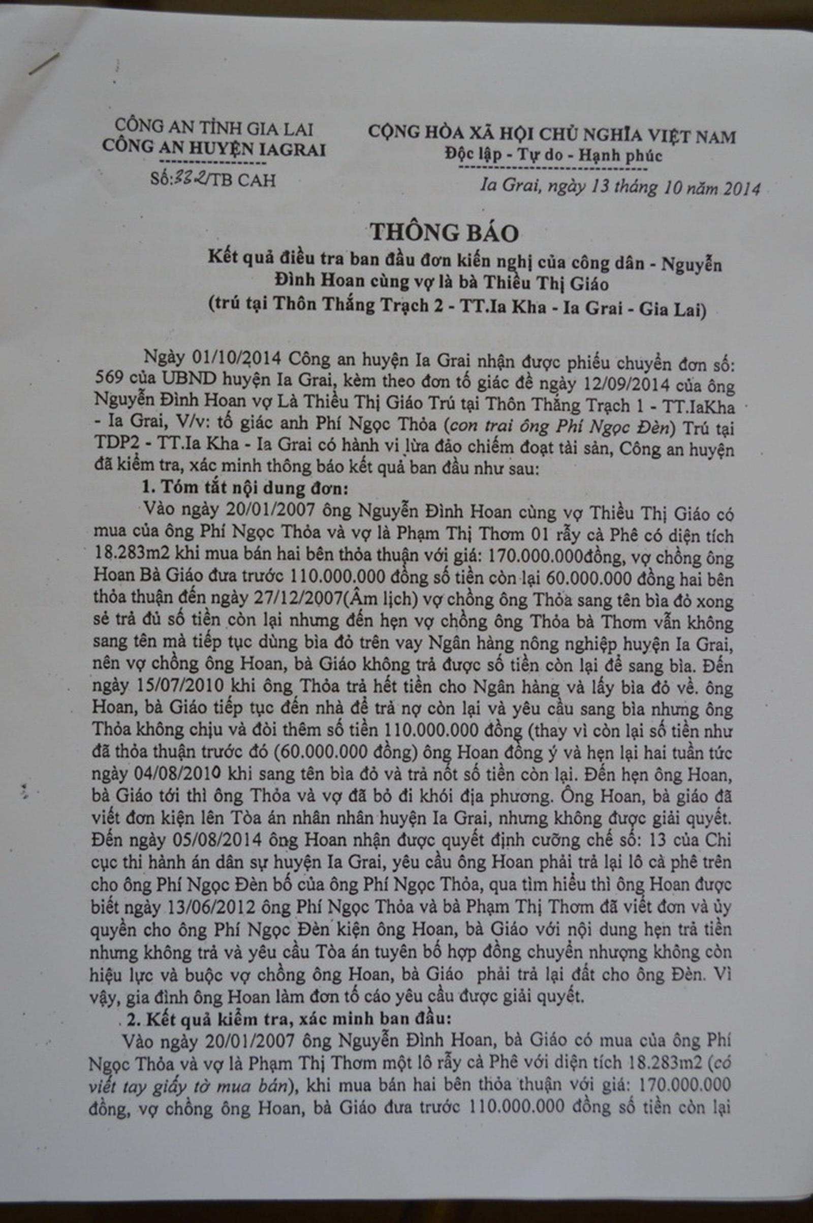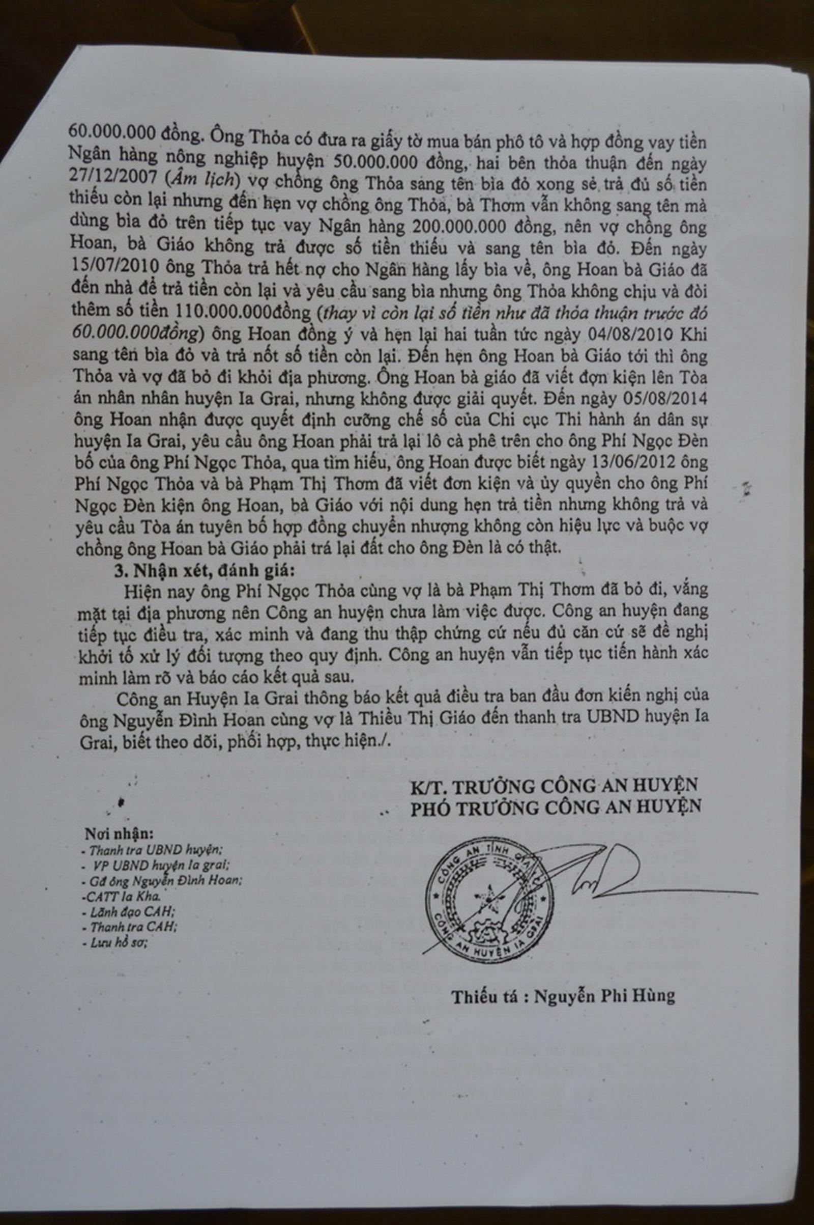 Theo kết quả kiểm tra, xác minh của Công an huyện Ia Grai, trong thỏa thuận, bà Giáo đưa trước cho ông Thỏa 110 triệu đồng. Lúc này, ông Thỏa có đưa ra hợp đồng vay 50 triệu đồng của Ngân hàng Nông nghiệp huyện. Hai bên thỏa thuận đến ngày 27/12/2007 (âm lịch) vợ chồng ông Thỏa sang tên bìa đỏ xong thì bà Giáo sẽ trả đủ số tiền còn lại. Tuy nhiên, đến hẹn, vợ chồng ông Thỏa vẫn không sang tên mà dùng bìa đỏ tiếp tục vay Ngân hàng 200 triệu đồng.