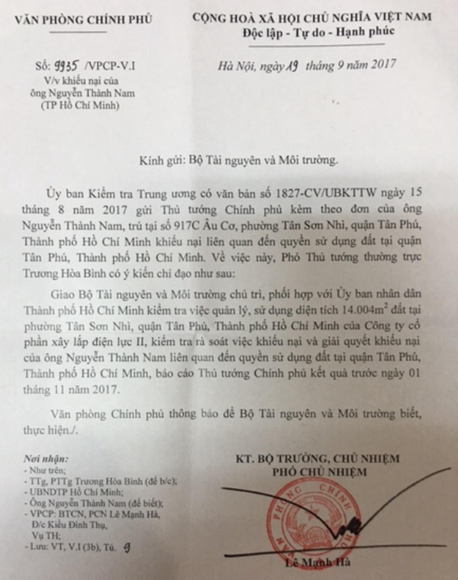 Theo đó, Phó Thủ tướng Chính phủ Trương Hòa Bình chỉ đạo giao Bộ Tài nguyên và Môi trường chủ trì, phối hợp cùng UBND TP Hồ Chí Minh kiểm tra việc quản lý, sử dụng hơn 14.000m2 đất tại số 16, phường Tân Sơn Nhì, quận Tân Phú, TP Hồ Chí Minh. Tiến hành kiểm tra rà soát việc khiếu nại và quá trình giải quyết khiếu nại của ông Nguyễn Thành Nam, báo cáo kết quả cho Thủ tướng Chính phủ trước ngày 1/11/2017.
