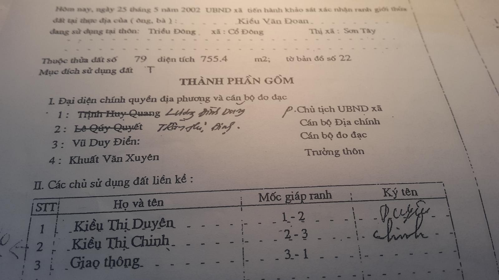 Chúng tôi được cung cấp biên bản xác định ranh giới, mốc giới thửa đất, ngày 25/5/2002, thành phần gồm các ông: Trịnh Huy Quang, Chủ tịch UBND xã Cổ Đông; Lê Quý Quyết, cán bộ địa chính; Vũ Duy Điền, cán bộ đo đạc; Khuất Văn Xuyên, Trưởng thôn. Cũng tại biên bản này, ông Trịnh Huy Quang và ông Lê Quý Quyết đã bị gạch tên và thay vào đó là ông Lương Đình Dũng với chức danh Phó Chủ tịch UBND xã và bà Trần Thị Định, cán bộ địa chính. (Tên đúng là Trần Kim Định, cán bộ địa chính của thị xã Sơn Tây được cử về để hỗ trợ xã chứ không phải là cán bộ địa chính xã - PV).