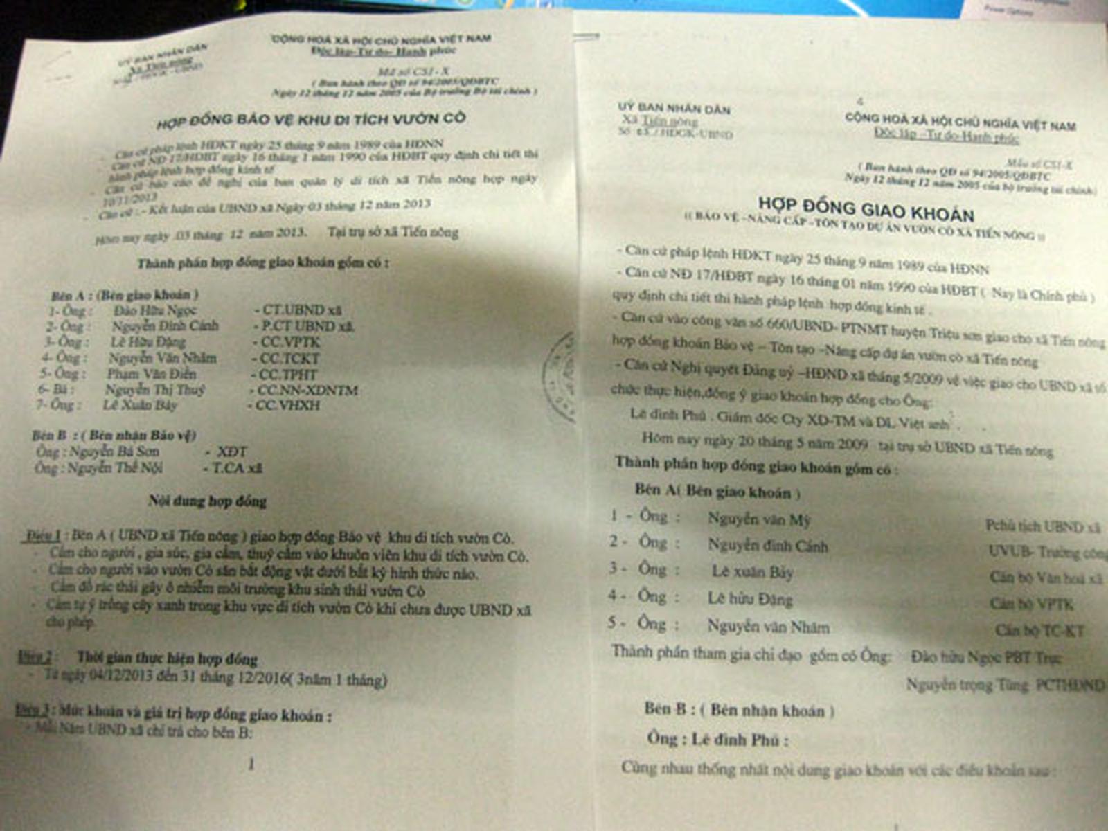 Hai bản hợp đồng giữa UBND xã Tiến Nông với Cty Việt Anh và Ban Công an, Ban Chỉ huy Quân sự xã. Ảnh: Văn Thanh