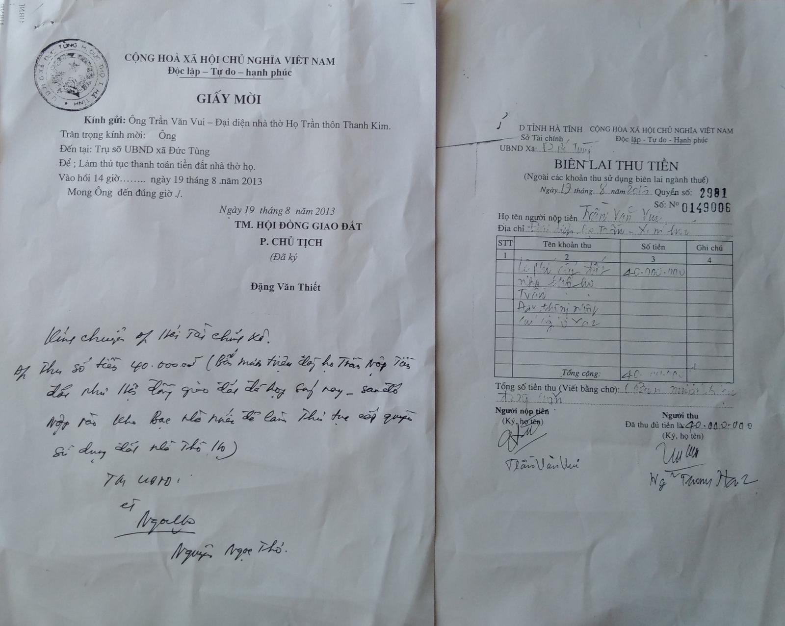 Ngày 19/8/2013, UBND xã Đức Tùng đã gửi giấy mời cho ông Trần Văn Vui - đại diện nhà thờ họ Trần ở xóm Hói, thôn Thanh Kim, yêu cầu đúng 14 giờ cùng ngày đến tại trụ sở UBND xã để “làm thủ tục thanh toán tiền đất nhà thờ họ”.