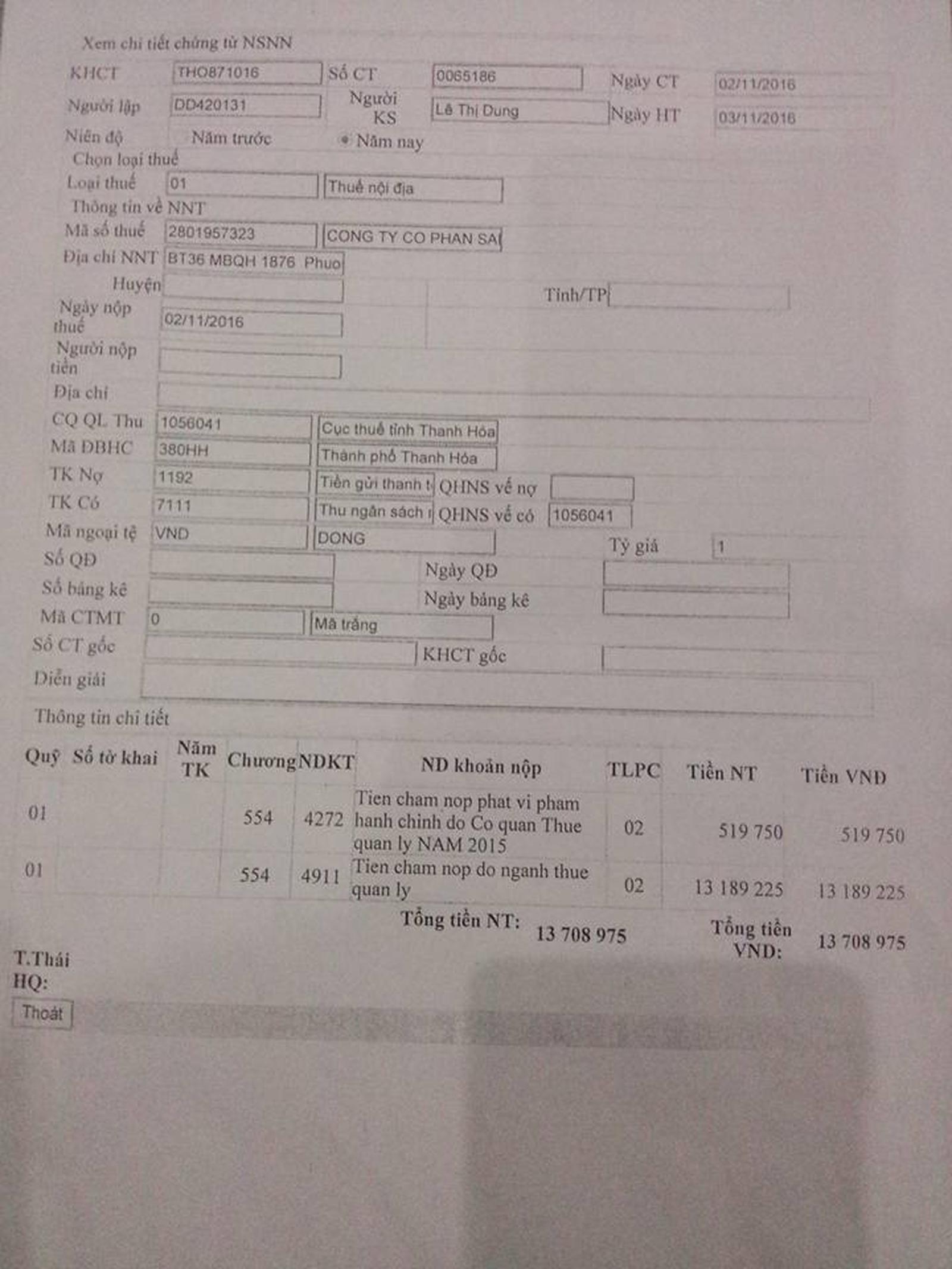 Ngày 27/10/2016, ông Vũ Quốc Dũng, Phó Cục trưởng Cục thuế Thanh Hóa ký Thông báo số 3147/TB-CT xác nhận cho Cty Cát Lợi (mã số thuế 2801957323, địa chỉ BT36 MBQH 1876, phường Đông Hương, TP Thanh Hóa) đã hoàn thành nghĩa vụ thuế, phí, lệ phí theo kê khai tại Cục thuế Thanh Hóa đến ngày 27/10/2016.