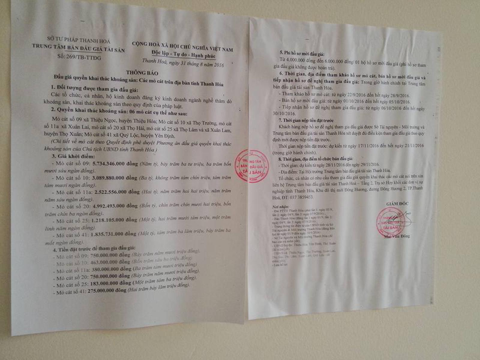 Trong khi đó, theo bảng niêm yết thông báo của Trung tâm Bán đấu giá tài sản Thanh Hóa về việc bán đấu giá quyền khai thác các mỏ cát trên địa bàn Thanh Hóa thì thời gian tham khảo hồ sơ mỏ cát từ ngày 22/9/2016 đến hết ngày 28/9/2016; bán hồ sơ mời đấu giá từ ngày 1/10 đến hết ngày 5/10/2016; tiếp nhận hồ sơ đề nghị tham gia đấu giá từ ngày 6/10 đến hết ngày 30/10/2016.