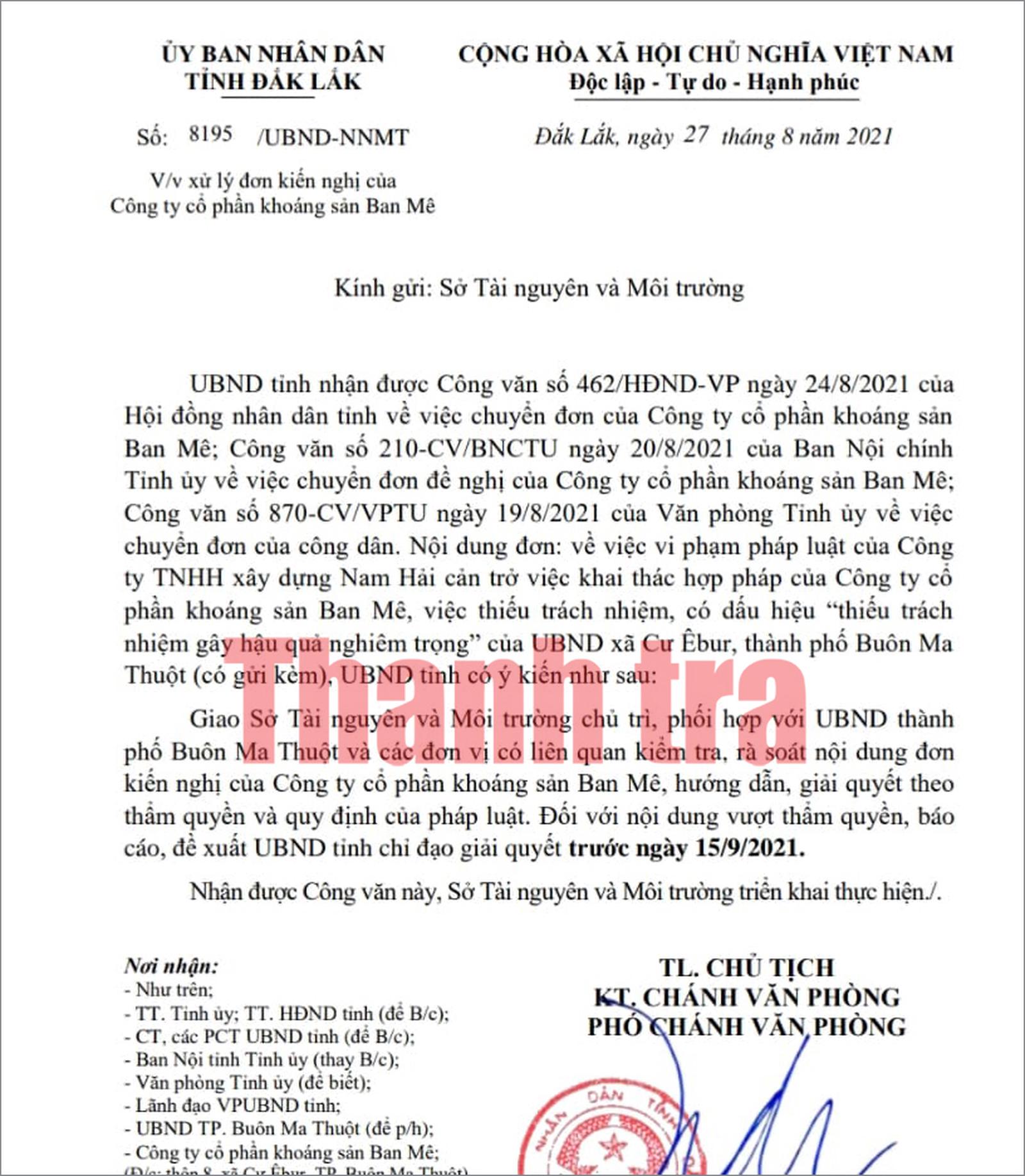 Ngày 27/8/2021, UBND tỉnh Đắk Lắk có Công văn số 8195/UBND-NNMT gửi Sở Tài nguyên và Môi trường (TN&MT) về việc xử lý đơn thư kiến nghị của Công ty Cổ phần Khoáng sản Ban Mê (Công ty Ban Mê).