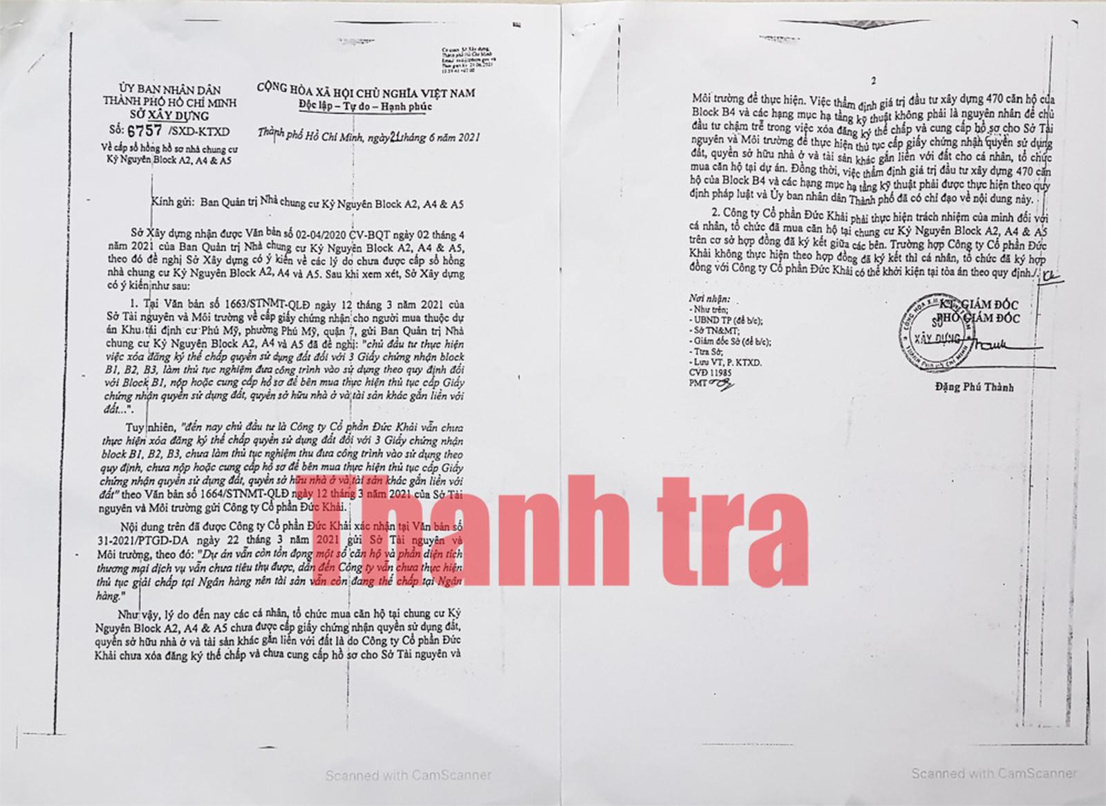 Liên quan đến những nội dung này, ngày 21/6/2021, Sở Xây dựng TP Hồ Chí Minh có Văn bản số 6757/SXD-KTXD về việc cấp số hồng hồ sơ nhà chung cư Kỷ Nguyên block A2, A4 và A5.