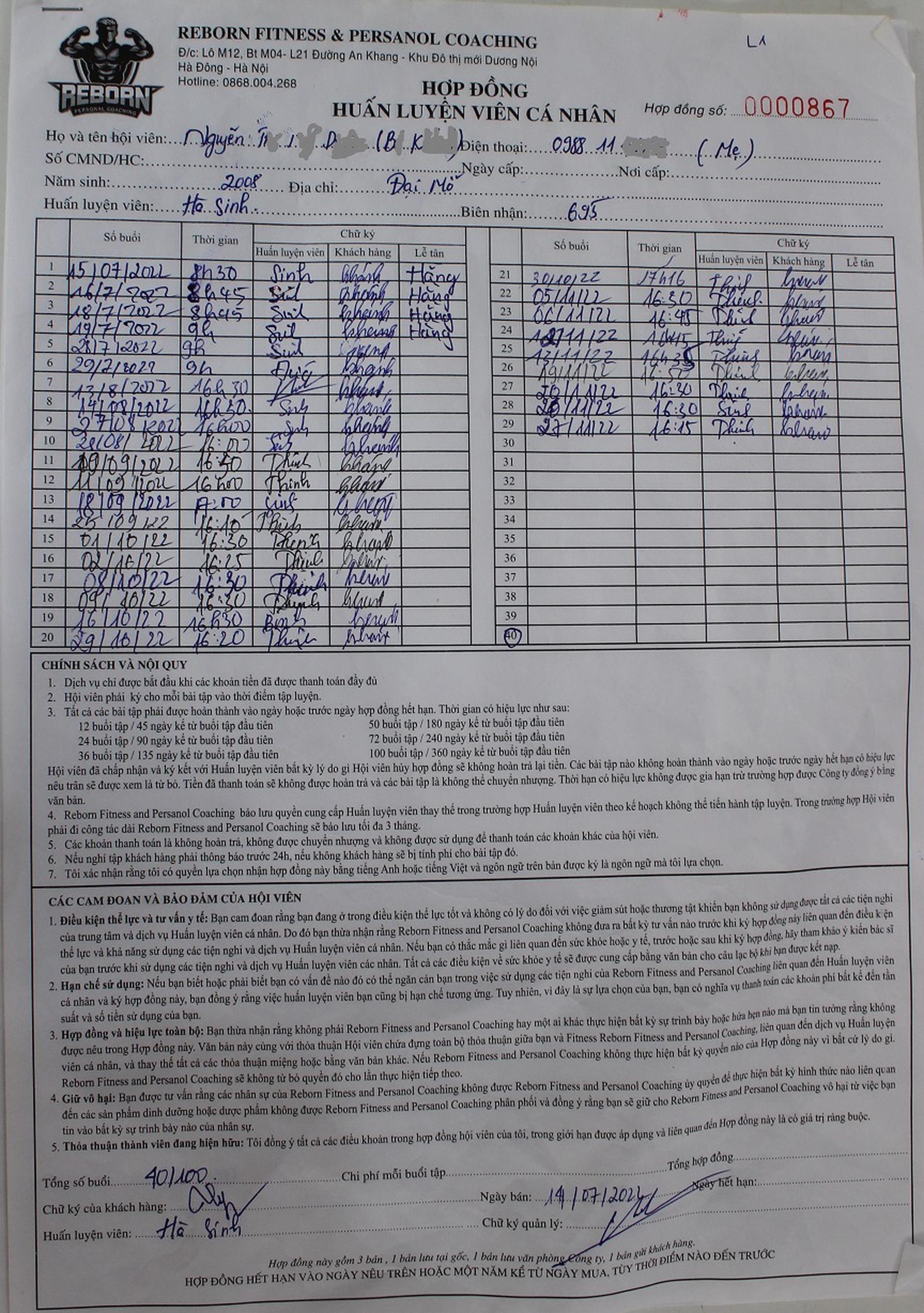 Chị N.T.M.D, đại diện phụ huynh và các học viên Đ.H.N và Đ.H.K hiện đang sử dụng dịch vụ tập luyện tại CLB Gym Reborn, rất bức xúc, chia sẻ: “Chủ cơ sở trước khi ký hợp đồng cam kết cung cấp dịch vụ HLV huấn luyện cá nhân (HLV riêng, có chuyên môn là ông Hà Văn Sinh) sẽ trực tiếp huấn luyện học viên, không sử dụng HLV khác, nhưng chỉ sau 5 buổi đầu, đã cho người không có chuyên môn, bằng cấp vào dạy, như thế là lừa đảo, là cung cấp dịch vụ sai. Các HLV kia không có chuyên môn, không dạy gì cả nên tôi yêu cầu trả lại học phí nhiều lần nhưng họ không trả”.