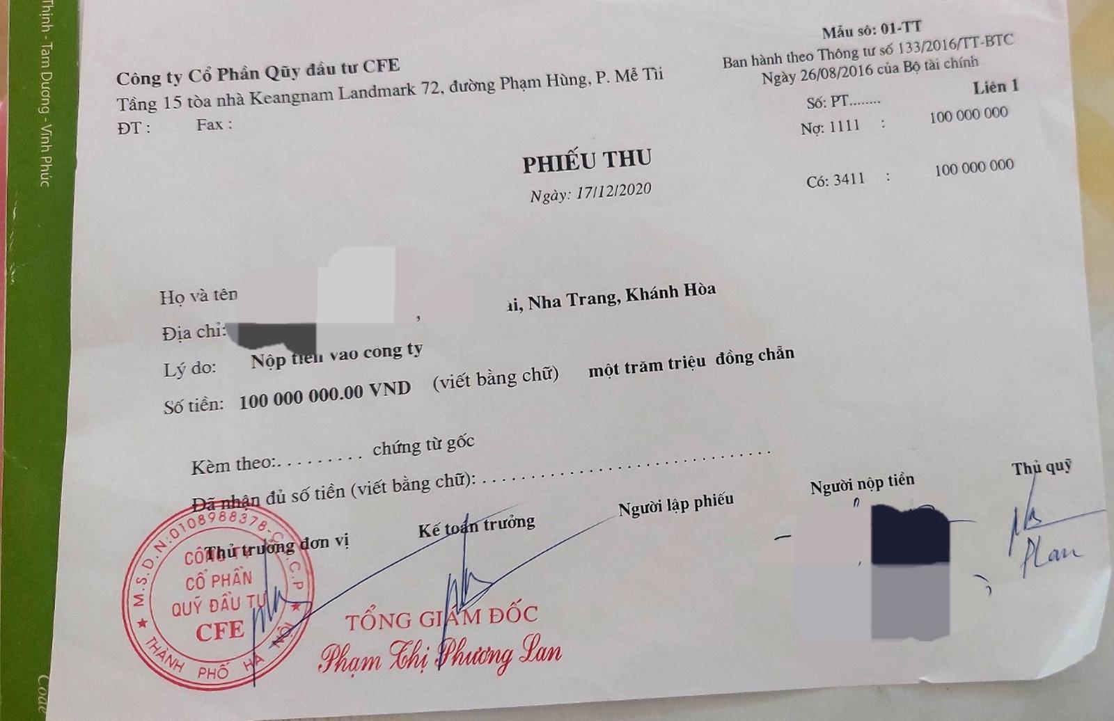Khi nhà đầu tư tìm và gọi nhiều lần, ngày 23/12/2021, bà Lan, vai trò Tổng Giám đốc Công ty CFE có viết tay và đóng dấu giấy cam kết sẽ thực hiện theo biên bản đã ký và chỉ đạo kế toán báo cáo, chi trả tiền cho bà V.T.T.