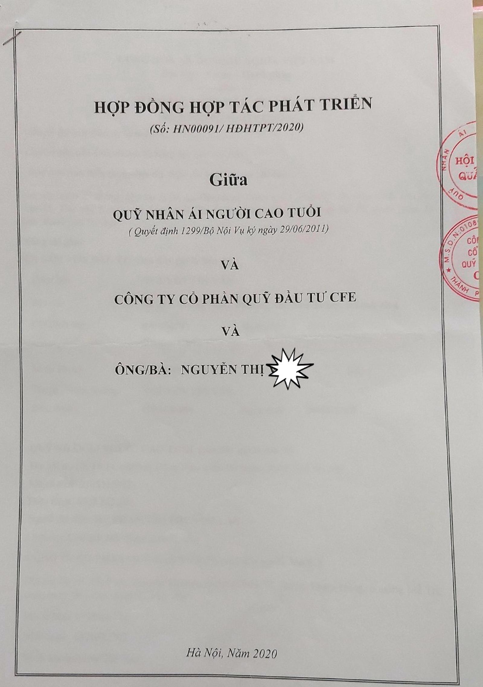 Theo nội dung hợp đồng hợp tác giữa các nhà đầu tư với Quỹ Nhân ái người cao tuổi và Công ty Cổ phần Quỹ Đầu tư CFE (Công ty CFE) do bà Lan là người đại diện ký, hàng tháng, Công ty CFE sẽ thanh toán tiền lãi cho nhà đầu tư vào một ngày cụ thể đã được thống nhất. Cùng với đó, sau khi hết hạn hợp đồng, nhà đầu tư sẽ được thanh lý và trả lại tiền đầu tư.
