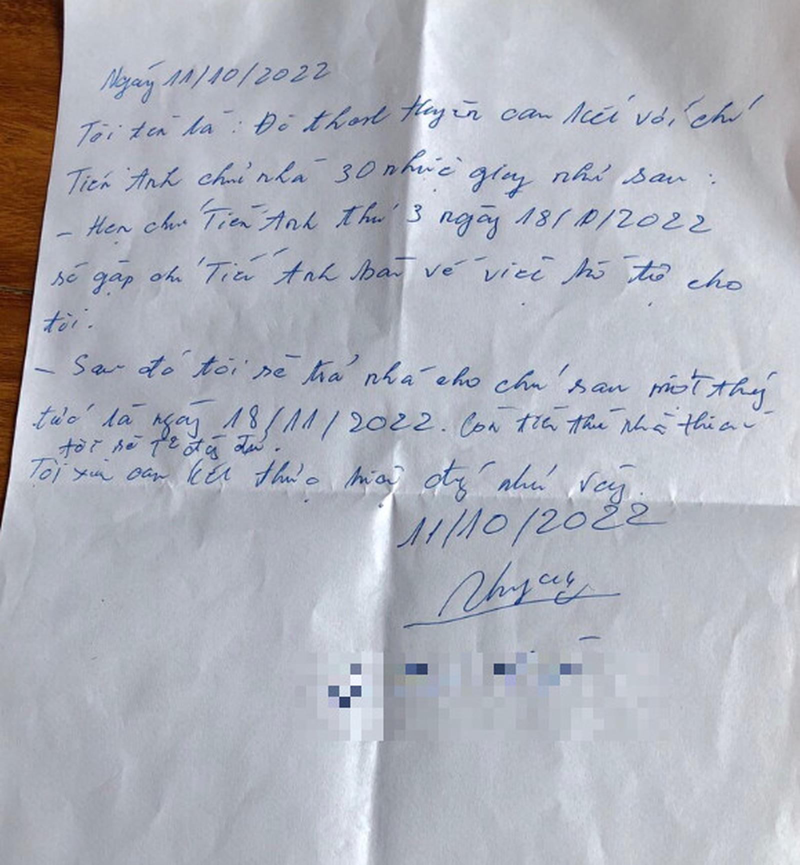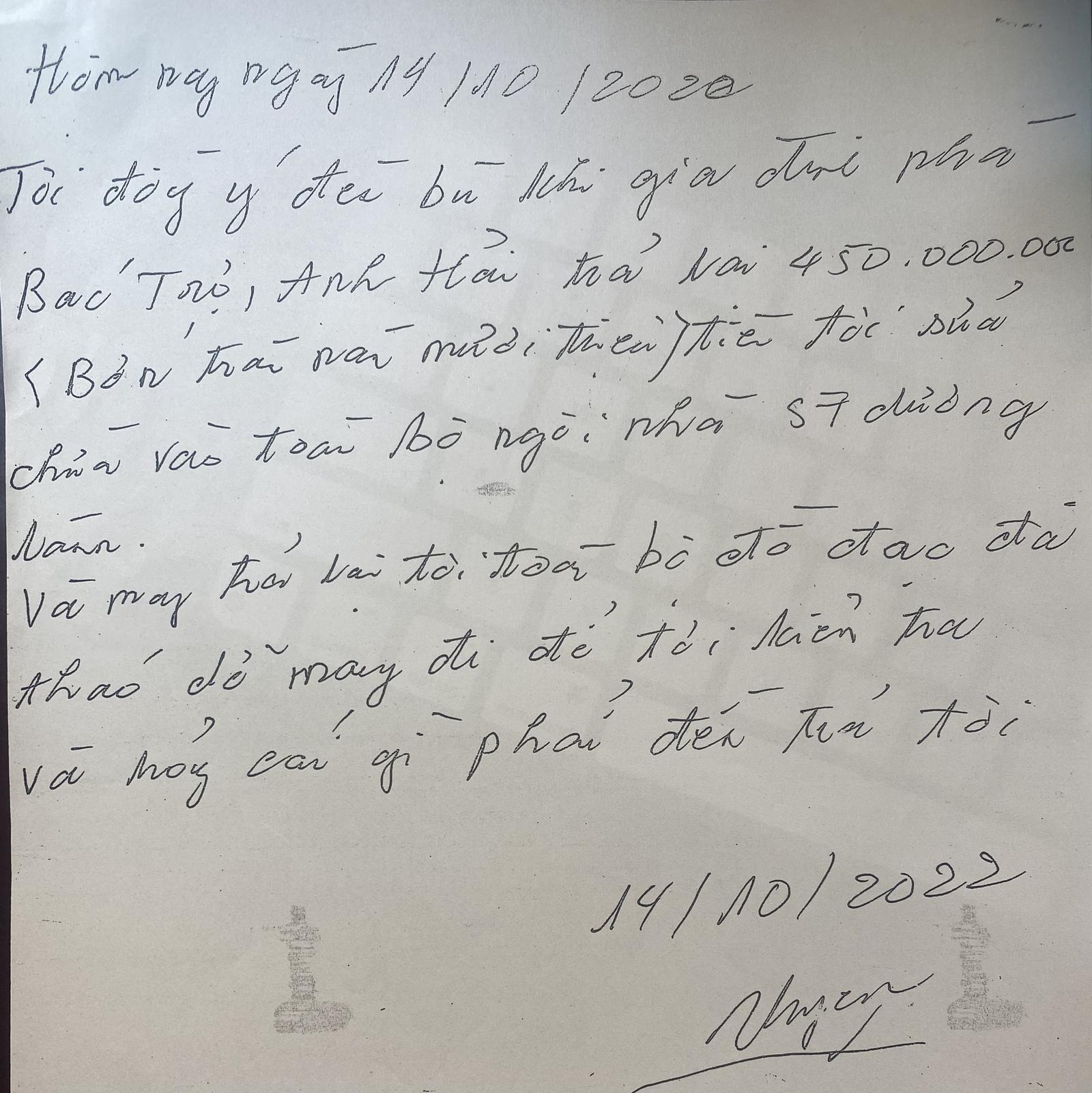 Ngày 14/10/2022, bà H viết giấy yêu cầu gia đình phải đền bù 450.000.000 đồng với lý do tiền sửa chữa nhà, nếu được đền bù sẽ tự nguyện đi khỏi nhà.