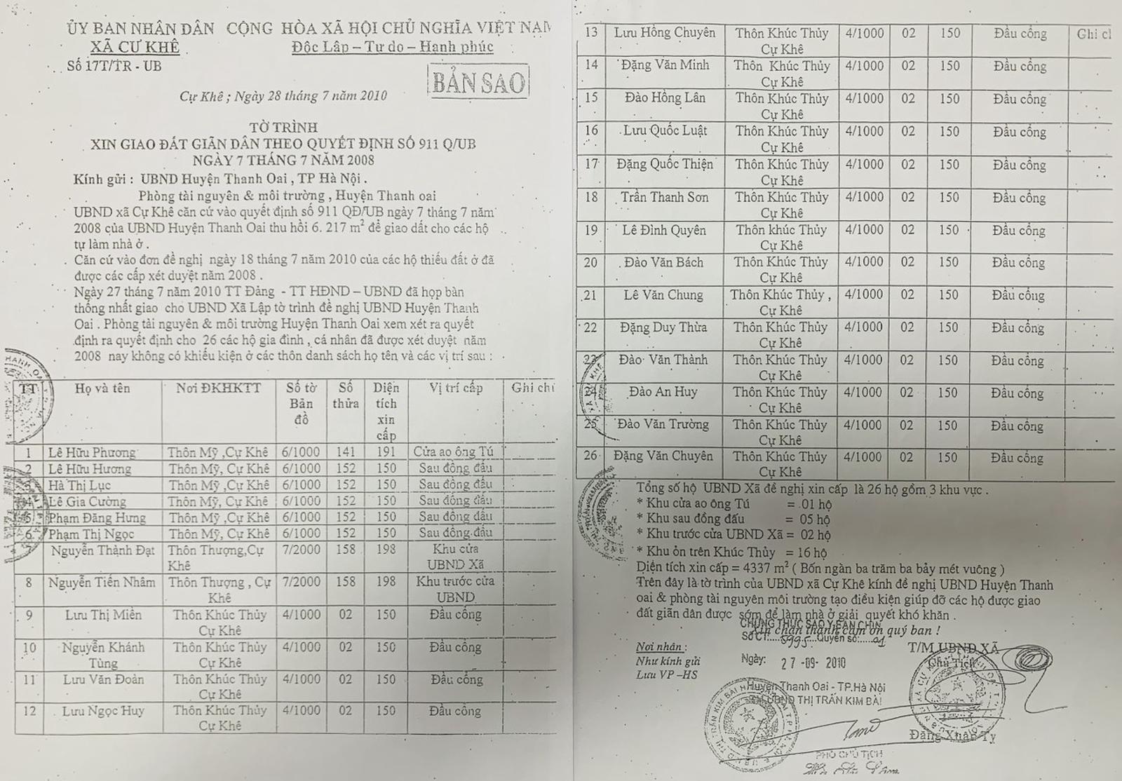 Ngày 28/7/2010, UBND xã Cự Khê có Tờ trình số 17T/TR-UB gửi UBND huyện Thanh Oai và Phòng Tài nguyên và môi trường (TN&MT) huyện về bản danh sách 26 hộ gia đình, cá nhân có đủ điều kiện được giao đất giãn dân với tổng diện tích xin cấp là 4.337m2, trong đó thôn Khúc Thủy có 18 hộ. Theo Tờ trình số 17T/TR-UB ngày 28/7/2010 của UBND xã Cự Khê mỗi hộ được cấp đất giãn dân 150m2.