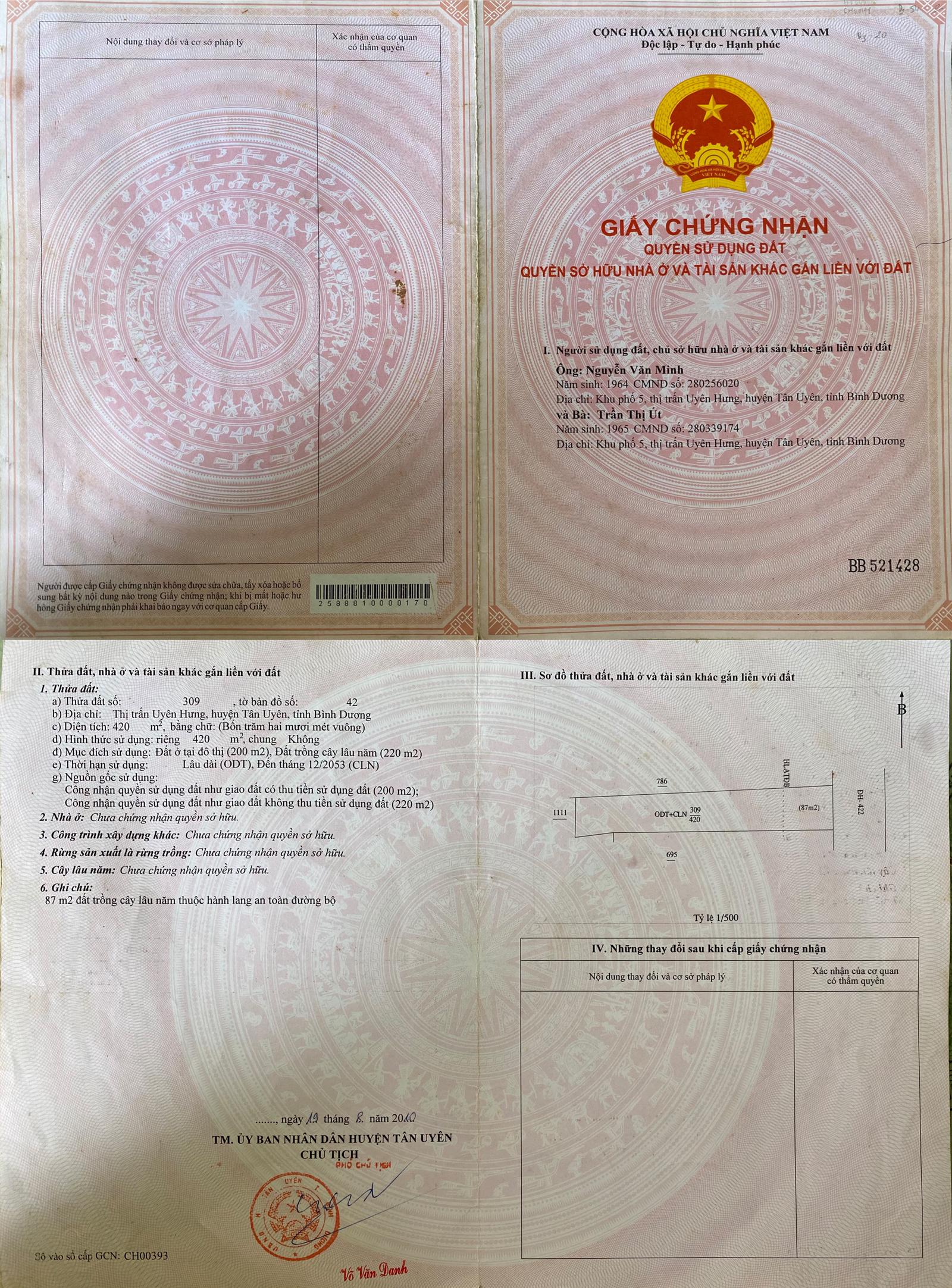 Ông Nguyễn Văn Minh và bà Trần Thị Út được cấp giấy chứng nhận thuộc thửa 309, tờ bản đồ 42 (tọa lạc tại phường Uyên Hưng, TP Tân Uyên), với diện tích 420m2. Trong đó, 220m2 đất trồng cây lâu năm và 200m2 đất thổ cư. Nguồn gốc đất nhận chuyển nhượng từ bà Nguyễn Thị Số (trú cùng địa chỉ trên) vào năm 2010.