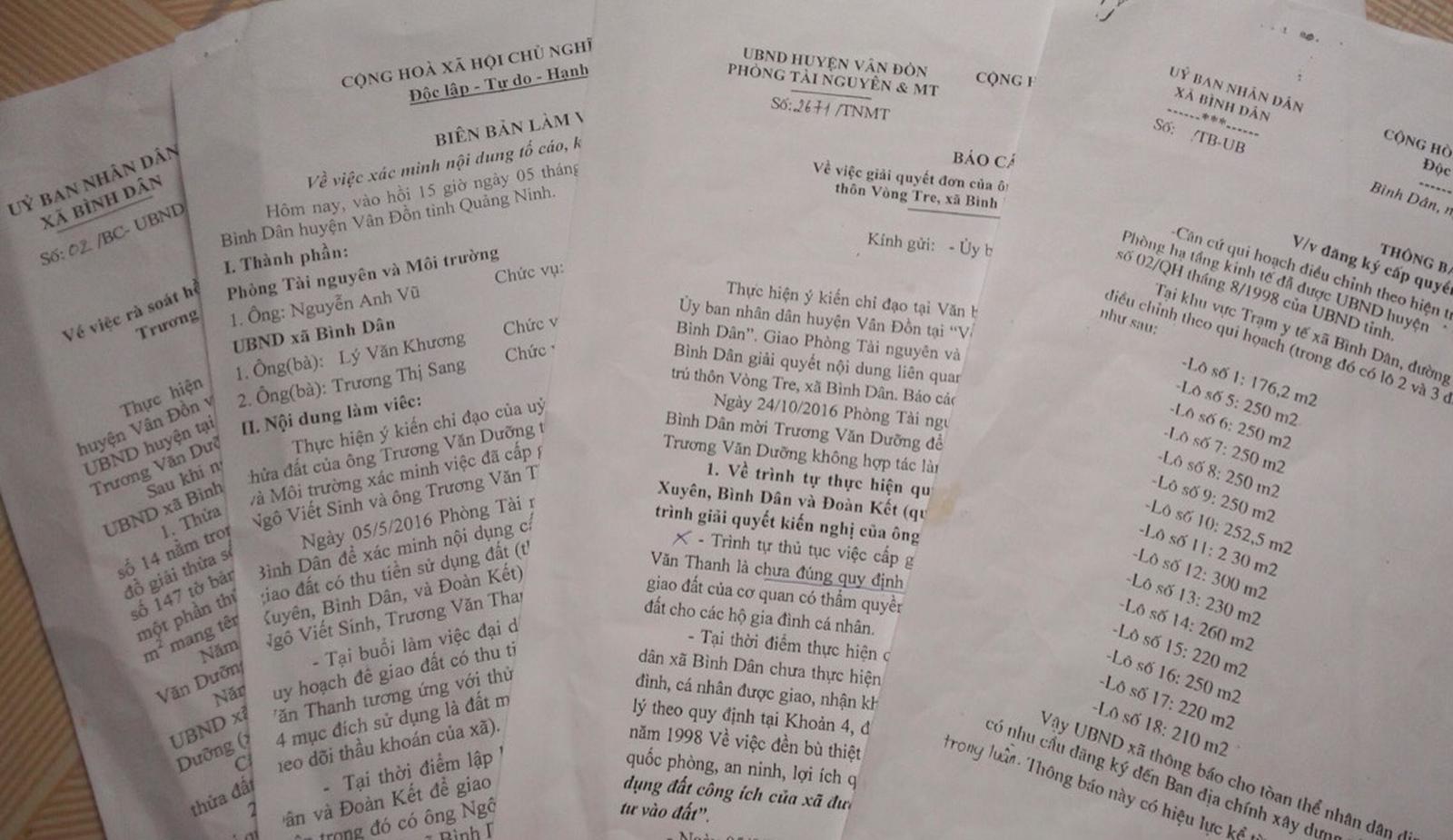Việc xác minh, kết luận nguồn gốc đất nhà ông Trương Văn Dưỡng thuộc quỹ đất 5% công ích của xã và nằm trong khu vực quy hoạch cụm 4 xã năm 1998 được thể hiện rõ trong 02 báo cáo số 02/BC-UBND ngày 18/01/2016 và báo cáo số 77/BC-UBND ngày 23/9/2016 của chủ tịch Lý Văn Khương. Biên bản làm việc ngày 05/5/2016 giữa Phòng Tài nguyên và Môi trường huyện Vân Đồn (Phòng TN&MT) với UBND xã Bình Dân. Báo cáo số 2671/TNMT, ngày 08/11/2016 việc giải quyết đơn khiếu nại của ông Dưỡng của Phòng Tài nguyên và Môi trường. Nội dung các văn bản trên cho thấy việc xác minh nguồn gốc đất của ông Dưỡng được chủ tịch xã xem xét, tổng hợp căn cứ vào các tài liệu còn lưu từ trước đến nay về quản lý nhà nước liên quan đến diện tích 300 m² đất nhà ông Dưỡng đang sử dụng. Báo cáo số 02, ngày 18/01/2016 có nhiều dữ liệu được đưa ra để kết luận là đất 5%, nhưng khi phóng viên yêu cầu cho xem các giấy tờ, sổ sách chứng lý căn cứ giao thầu đất cho nhà ông Dưỡng thì ông Khương chỉ đưa ra được một quyển sổ giao đất không rõ nguồn ngốc, không ngày tháng và không biết do ai lập sổ. Nội dung sổ giao đất cho hộ ông Dưỡng ghi chép khó hiểu và không thể hiện vị trí đất nói trên. Còn nữa, cuốn sổ giao đất không rõ nguồn gốc này tiếp tục là tài liệu căn cứ duy nhất để UBND xã Bình dân một lần nữa khẳng định diện tích 300m² đất nhà ông Dưỡng thuộc đất 5% trong biên bản làm việc ngày 5/5//2016. Căn cứ từ 02 báo cáo trên của chủ tịch xã Bình Dân và buổi làm việc xác minh thửa đất nhà ông Dưỡng của đại diện Phòng TN&MT huyện Vân Đồn tại trụ sử UBND xã. Trong báo cáo tham mưu, kiến nghị UBND huyện Vân Đồn của Phòng TN&MT huyện Vân Đồn cũng thừa nhận và kết luận đất của hộ ông Dưỡng thuộc quỹ đất 5% của xã Bình Dân và đề nghị UBND huyện chỉ đạo thực hiện bồi thường, hỗ trợ chi phí vào đất cho hộ ông Dưỡng cũng như các hộ dân khác.