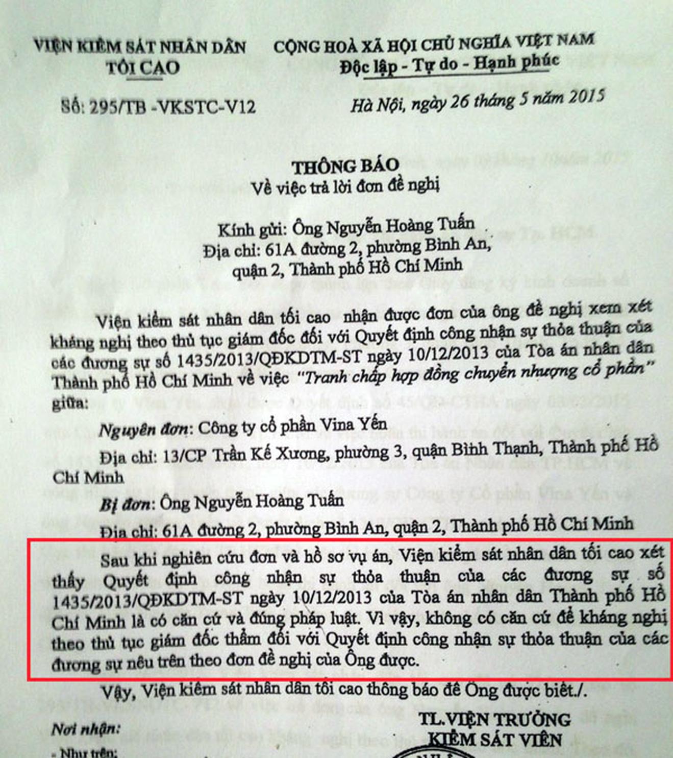 Ở một diễn biến khác, sau khi TAND TP HCM ban hành Quyết định công nhận thỏa thuận số 1435, ông Nguyễn Hoàng Tuấn đã làm đơn gửi Viện KSND Tối cao đề nghị xem xét kháng nghị theo thủ tục giám đốc thẩm. Ngày 26/5/2015, Viện KSND Tối cao đã ban hành Thông báo trả lời đề nghị của ông Tuấn. Cụ thể: “Sau khi nghiên cứu đơn và hồ sơ vụ án, Viện KSND Tối cao xét thấy Quyết định thỏa thuận 1435 là có căn cứ và đúng pháp luật. Vì vậy, không có căn cứ để kháng nghị theo thủ tục giám đốc thẩm...”.