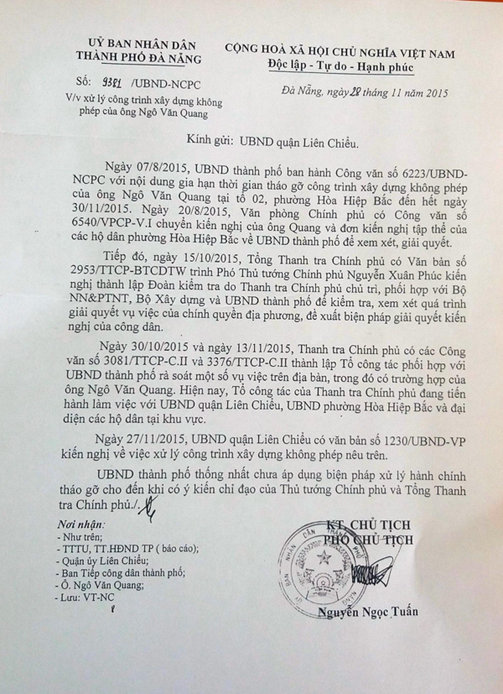 Ngày 28/11, UBND TP có Văn bản số 9381/UBND-NCPC do Phó Chủ tịch Nguyễn Ngọc Tuấn ký, về việc xử lý công trình xây dựng không phép của ông Quang. Theo đó, ngày 20/8, Văn phòng Chính phủ có Công văn số 6540/VPCP-V.I chuyển kiến nghị của ông Quang và đơn kiến nghị tập thể của các hộ dân phường Hoà Hiệp Bắc (Liên Chiểu) về UBND TP xem xét, giải quyết.