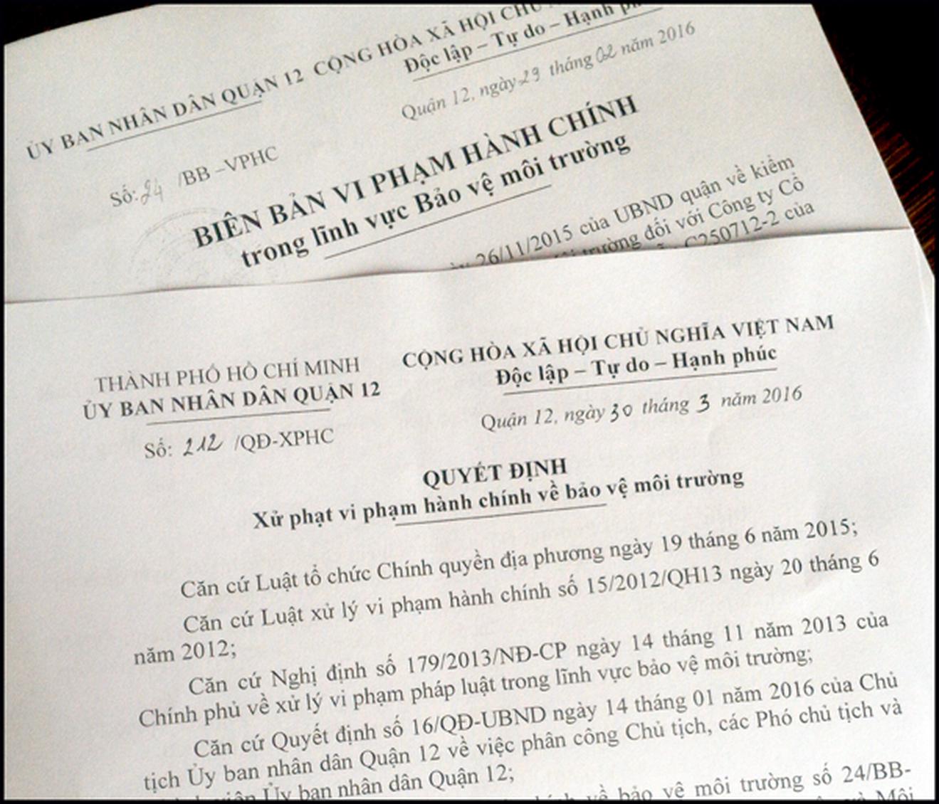 Trong quá trình tác nghiệp, chúng tôi phát hiện Cty May Phương Đông đã bị xử phạt vì xả nước thải vượt quy chuẩn cho phép. Cụ thể: Ngày 30/3/2016, UBND quận 12 đã ban hành Quyết định số 212 xử phạt vi phạm hành chính về bảo vệ môi trường đối với Cty May Phương Đông (do bà Nguyễn Bảo Trân làm Tổng Giám đốc đại diện theo pháp luật) 60 triệu đồng.