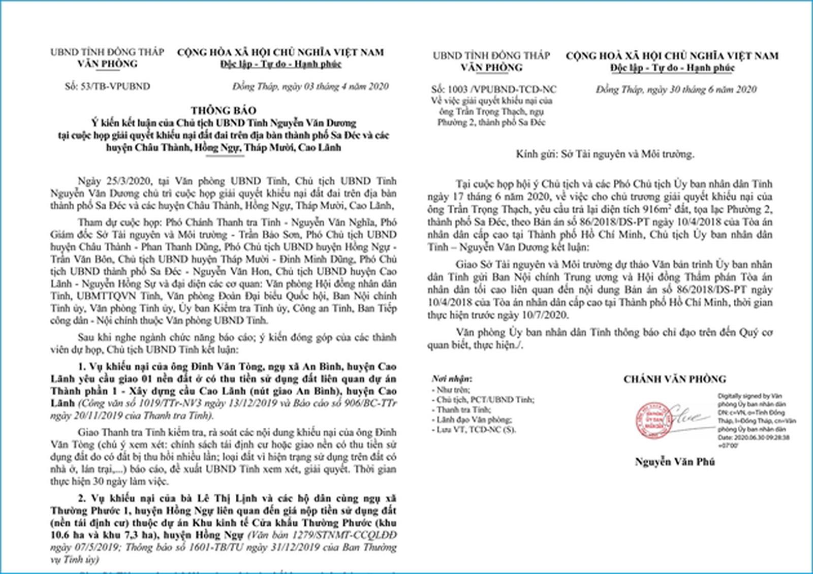 Trước đó, ngày 11/11/2019, sau khi tiếp nhận Bản án số 86/2018/DS-PT của TAND Cấp cao tại TP Hồ Chí Minh và đơn khiếu nại của ông Trần Trọng Thạch, UBND tỉnh Đồng Tháp đã có Thông báo số 80/TB-UBND về việc thụ lý giải quyết khiếu nại lần đầu đối với đơn của ông Thạch.