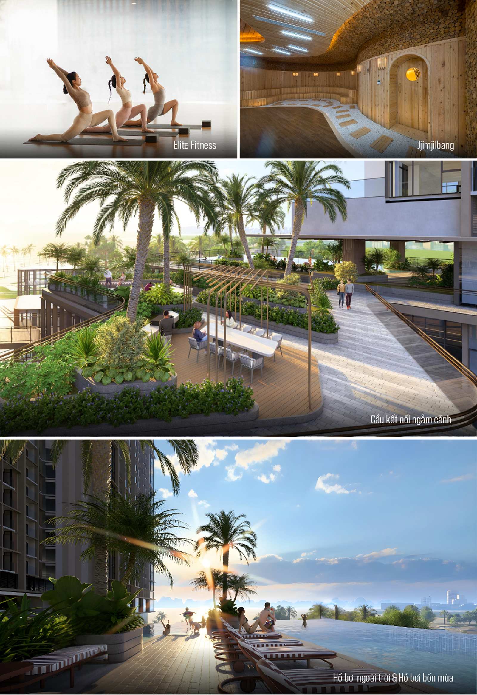 Các tầng trung gian được kiến tạo như những “điểm dừng” tái tạo năng lượng và chăm sóc sức khỏe, với sự hiện diện của CLB thể thao 5 sao Elite Fitness, mô hình Jjimjilbang Hàn Quốc, hệ thống hồ bơi, Jacuzzi cùng các khoảng xanh tĩnh tại. Hai tòa tháp được kết nối bằng cầu đi bộ tại tầng 4, mở ra những điểm ngắm cảnh và không gian thư giãn hướng vịnh.