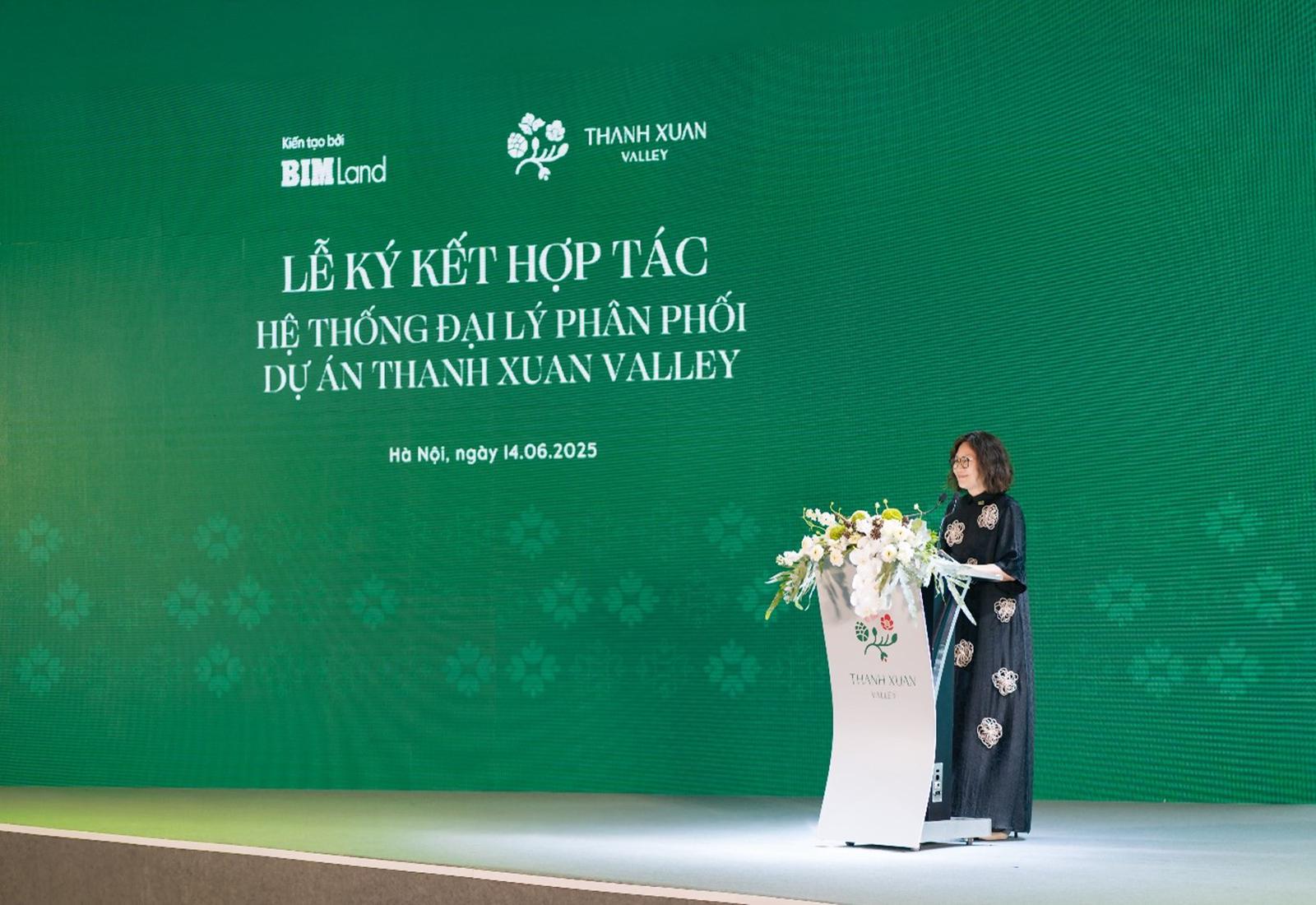 Phát biểu tại sự kiện, bà Nguyễn Hương Giang - Giám đốc Khối Thương mại Bất động sản BIM Land bày tỏ tin tưởng với sự đồng hành của các đối tác giàu kinh nghiệm sẽ mang đến những kết quả thành công cho dự án Thanh Xuan Valley trong năm 2025. Ảnh BIM Land.