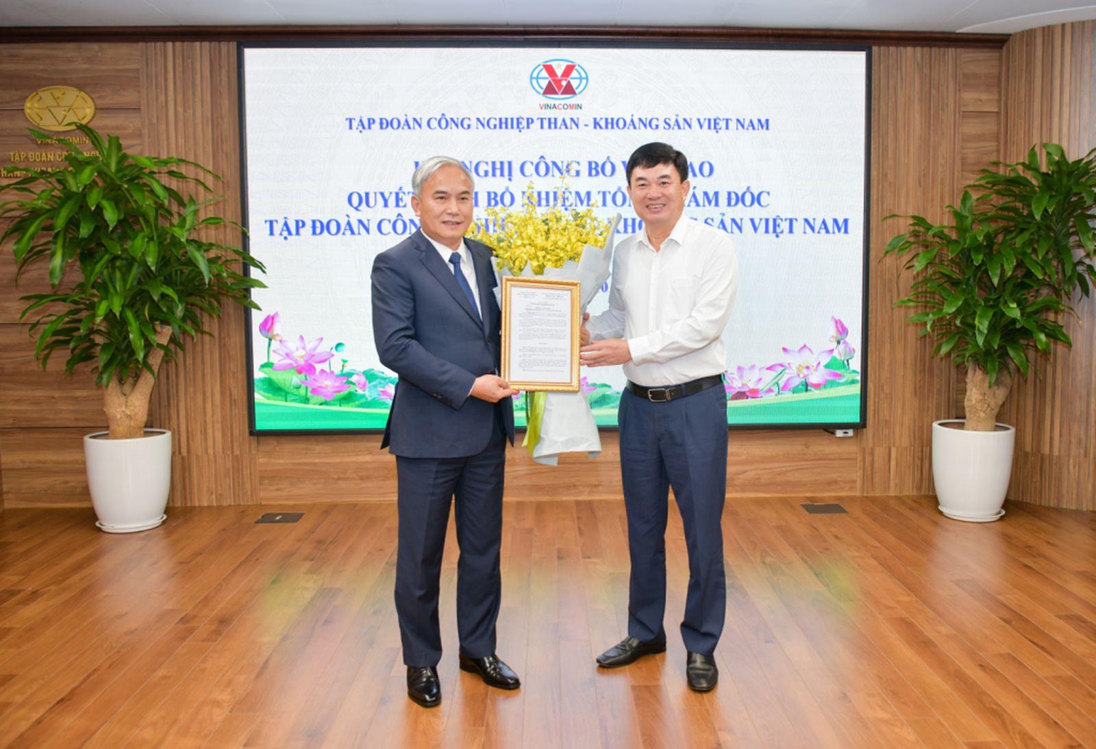 Bí thư Đảng ủy, Chủ tịch HĐTV Tập đoàn Ngô Hoàng Ngân trao quyết định bổ nhiệm chức vụ Tổng giám đốc cho ông Vũ Anh Tuấn. Ảnh: TKV