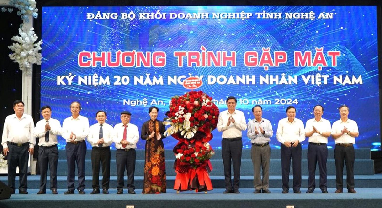 Lãnh đạo tỉnh Nghệ An chúc mừng Đảng uỷ khối, các hội, hiệp hội doanh nghiệp tại lễ kỷ niệm 20 năm Ngày Doanh nhân Việt Nam do Đảng ủy khối Doanh nghiệp tổ chức. Ảnh: ĐUK