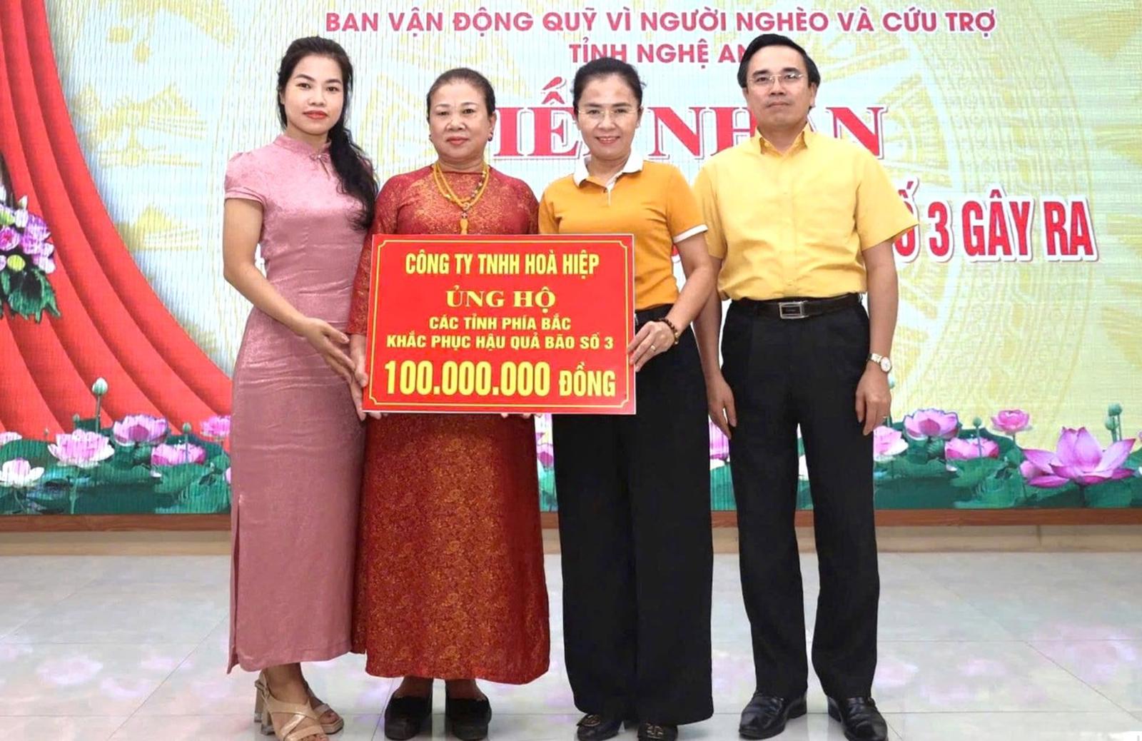 Lãnh đạo Công ty TNHH Hoà Hiệp ủng hộ đồng bào phía Bắc khắc phục hậu quả lũ lụt sau bão số 3 thông qua Ủy ban MTTQ tỉnh. Ảnh: HH