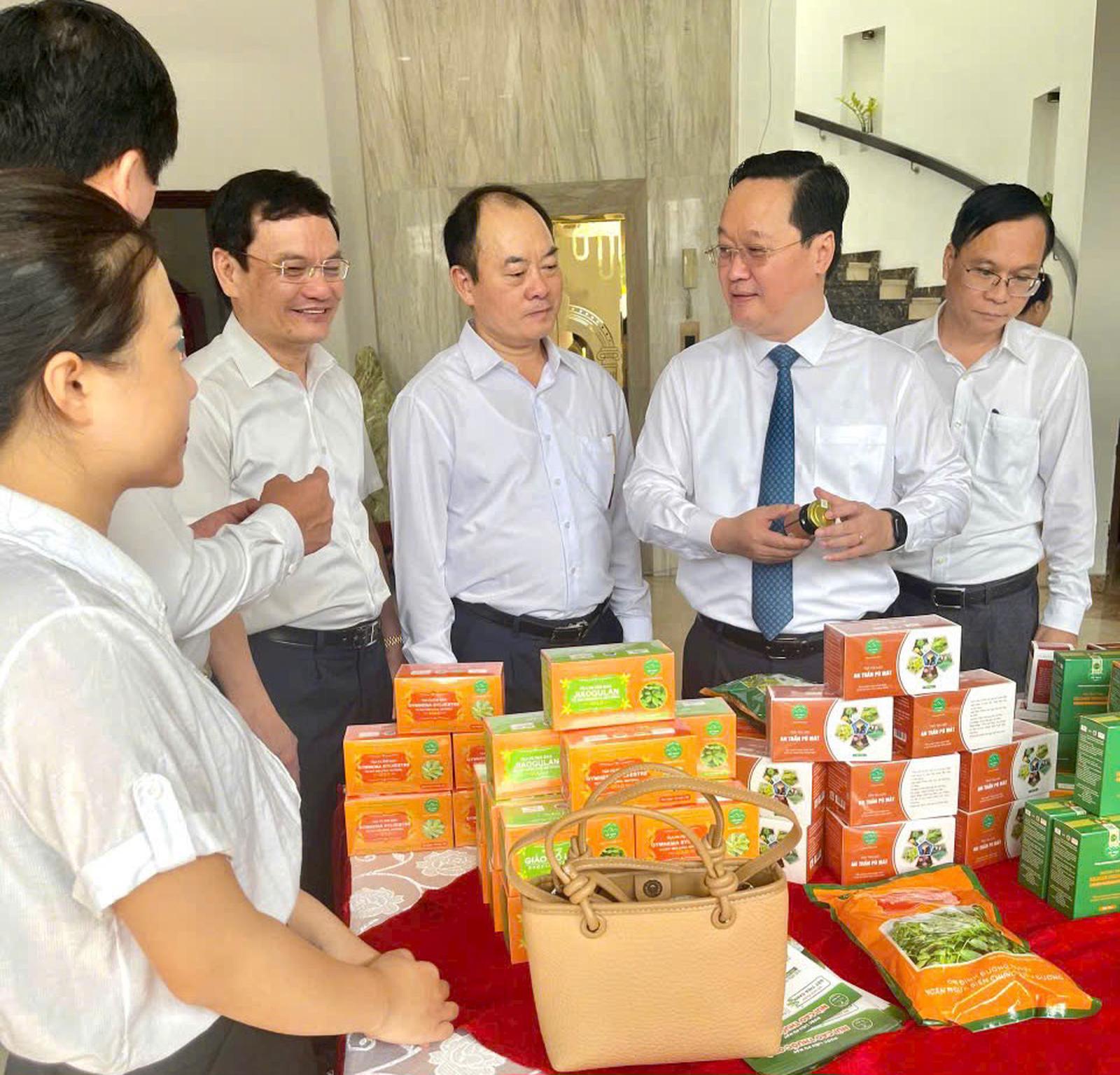 Chủ tịch UBND tỉnh tham quan gian trưng bày Công ty CP Dược liệu Pù Mát tại buổi khai trương giới thiệu sản phẩm OCOP và đặc sản tỉnh Nghệ An (11/10). Ảnh: P.X.D
