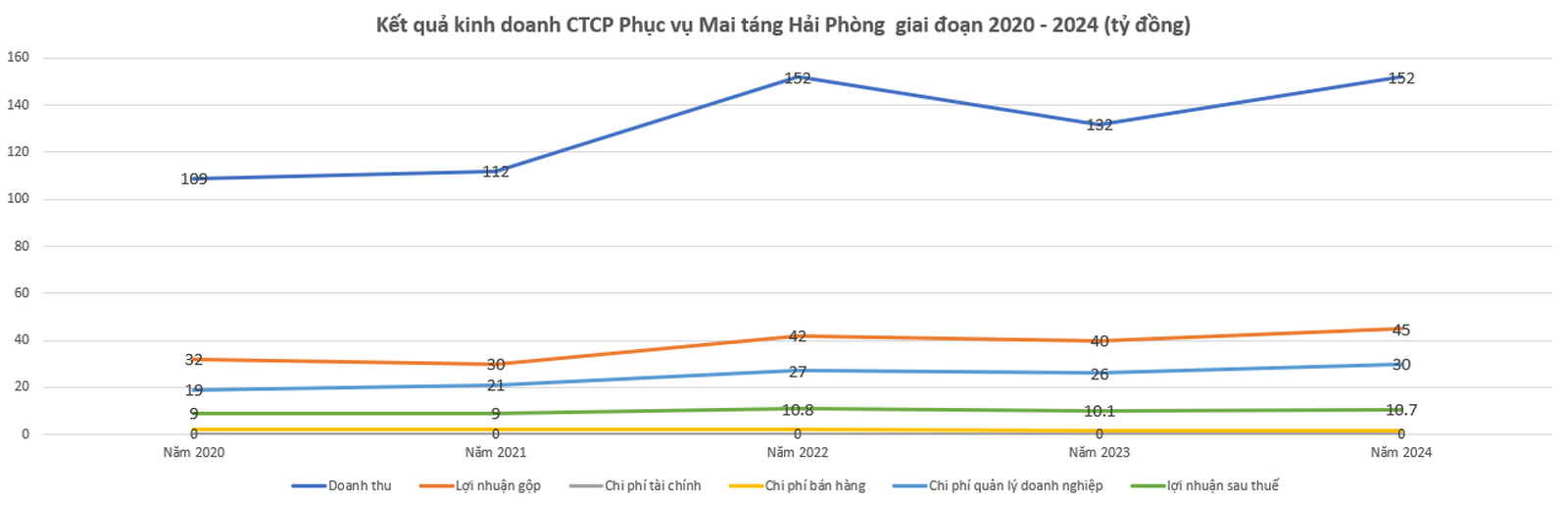 Trên thực tế, tính trong giai đoạn 2020 - 2024, doanh thu CTCP Phục vụ Mai táng Hải Phòng có sự tăng trưởng mạnh. Theo đó, năm 2020, doanh thu công ty đạt 109 tỷ đồng, tăng lên 112 tỷ đồng năm 2021, đạt 152 tỷ đồng năm 2022, giảm nhẹ về 132 tỷ đồng năm 2023 và tăng lại lên 152 tỷ đồng năm 2024. Như vậy, có thể thấy, sau 5 năm doanh thu công ty đã tăng đến 39% (tính trung bình tốc độ tăng trưởng doanh thu công ty là khoảng 7,8%/năm).