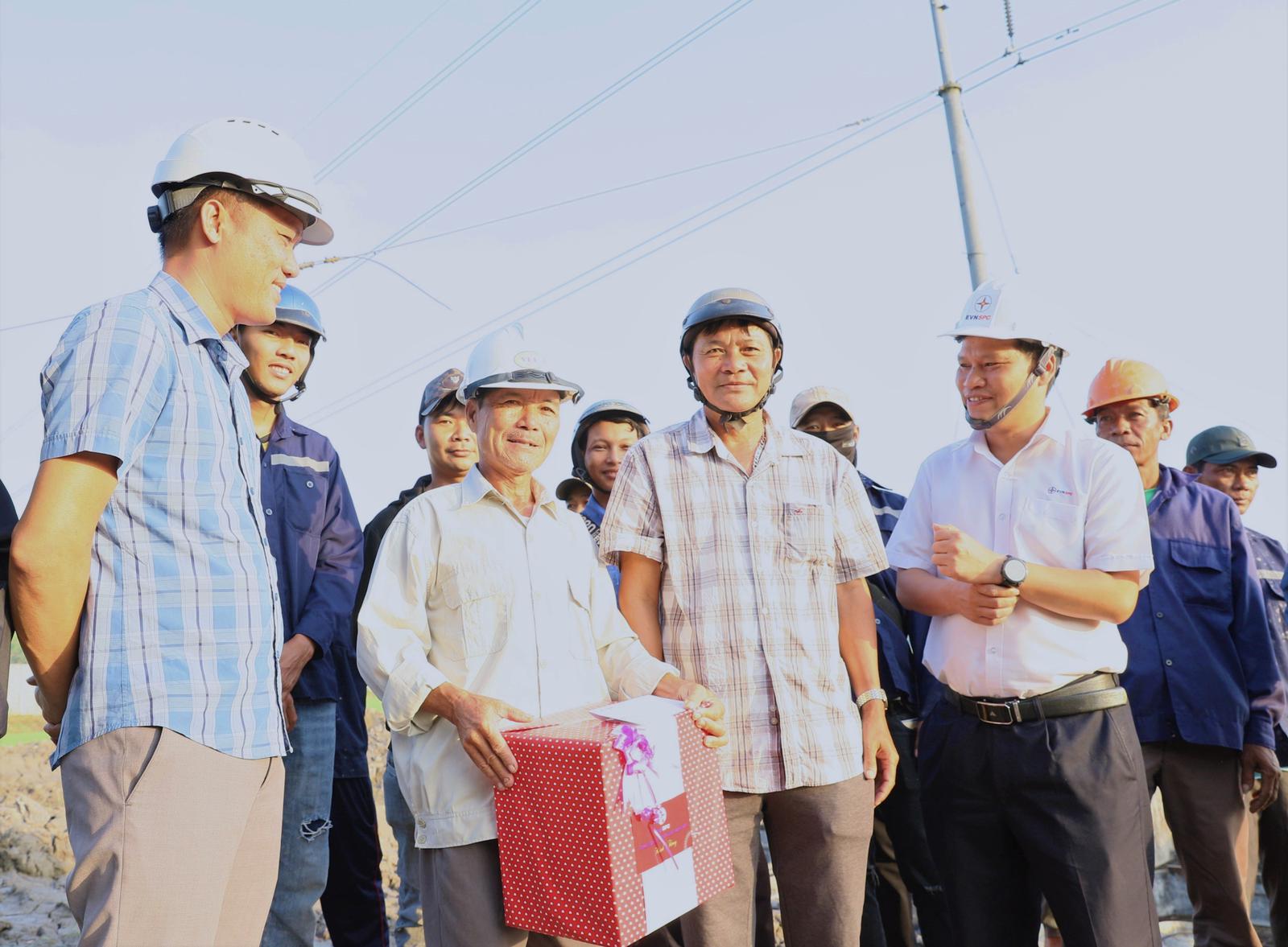 Tổng Giám đốc EVNSPC Nguyễn Phước Đức (đứng giữa) và Thành viên HĐTV Lê Xuân Hải (thứ 2 từ trái sang) đôn đốc các dự án trên địa bàn tỉnh Vĩnh Long. Ảnh: EVNSPC