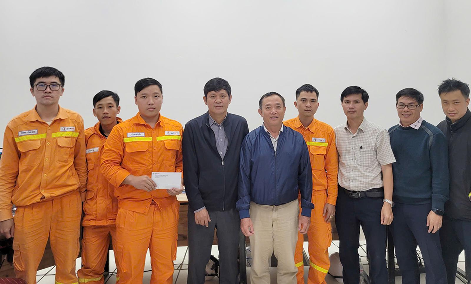 Đại diện CPMB tặng quà động viên ca trực đóng điện dự án tại Trạm biến áp 500kV Quảng Trị. Ảnh: EVNNPT.