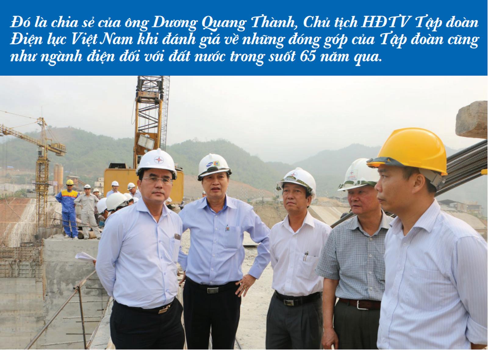 + PV: 65 xây dựng và phát triển, ngành Điện lực Việt Namnói chung, EVN nói riêng đã có những bước tiến vượt bậc, đượcĐảng, Chính phủ đánh giá cao. Xin ông cho biết, những bướctiến đó là gì?- Ông Dương Quang Thành: 65 năm là chặng đường không dài tronglịch sử hàng nghìn năm dựng nước và giữ nước của dân tộc, tuy nhiên, vớinhững gì mà ngành Điện đã đóng góp cho đất nước, cho nhân dân trong suốt65 năm qua, nhất là đối với sự nghiệp xây dựng và bảo vệ tổ quốc, có thểkhẳng định, ngành Điện đã hoàn thành sứ mệnh lịch sử của mình “Điện đitrước một bước”.Có thể dễ dàng thấy được điều này nếu so sánh hệ thống điện từ ngày tiếpquản, với tổng công suất đặt từ 31,5MW (năm 1954) lên tới gần 55.000MW(hiện nay) – gấp khoảng 1.700 lần! Từ một hệ thống điện nhỏ bé, lạc hậu vàmanh mún, sau 65 năm, hệ thống điện Việt Nam đã đứng thứ 23 thế giới vàthứ 2 trong khu vực Đông Nam Á, với đa dạng các nguồn điện và hệ thốnglưới điện các cấp điện áp từ truyền tải đến phân phối đã vươn tới 63 tỉnh/thành phố của cả nước.Từ chỗ điện chỉ là nguồn sáng dành cho bộ phận nhỏ chế độ thực dân caitrị, đến nay điện lưới quốc gia đã về tận các bản làng heo hút, các miền hảiđảo xa xôi với 100% số xã và 99,47% số hộ dân cả nước được sử dụng điệnvới chất lượng ngày càng cao. EVN đã đảm nhận cấp điện cho 11/12 huyệnđảo góp phần đảm bảo an ninh quốc phòng, xây dựng kinh tế, bảo vệ chủquyền và toàn vẹn lãnh thổ của đất nước. Theo đánh giá của Ngân hàng Thếgiới, Việt Nam là quốc gia thực hiện thành công và đạt hiệu quả cao về đầu tưđiện nông thôn, là hình mẫu để nhiều quốc gia trên thế giới học tập.Cùng với đó, công tác kinh doanh và dịch vụ khách hàng có nhiều chuyểnbiến tích cực. Chỉ số tiếp cận điện năng đã được cải thiện, hàng năm gópphần đáng kể trong việc cải thiện môi trường kinh doanh và nâng cao nănglực cạnh tranh quốc gia. Chỉ số tiếp cận điện năng của Việt Nam đứng ở vịtrí 27/190 quốc gia, nền kinh tế, vươn lên vị trí thứ 4 khu vực ASEAN (vượttrước 2 năm theo yêu cầu của Chính phủ).Trong năm 2018, EVN được Fitch Ratings đánh giá và xếp hạng tín nhiệmquốc tế ở mức BB, đây là mức tín nhiệm tích cực; được Hội đồng Doanhnghiệp vì sự phát triển bền vững Việt Nam đánh giá là Doanh nghiệp bềnvững Việt Nam năm 2018; được Tổ chức Hướng tới minh bạch đánh giá là 1trong các doanh nghiệp nhà nước hàng đầu về minh bạch thông tin.Điện đã đem nguồn sáng, thắp niềm tin, tạo động lực cho sự phát triểnkinh tế - xã hội nói chung, cải thiện đời sống người dân nông thôn nói riêng,góp phần hiện thực hóa các chương trình mục tiêu quốc gia về xóa đói giảmnghèo. Đến nay đã có trên 90% số xã đạt Tiêu chí số 4 trong 19 tiêu chí xâydựng nông thôn mới, thực hiện điện khí hóa nông thôn, cũng như thúc đẩysự nghiệp công nghiệp hóa – hiện đại hóa đất nước, đảm bảo sự phát triểnbền vững trong thời kỳ hội nhập kinh tế quốc tế, giữ vững an ninh quốcphòng và toàn vẹn lãnh thổ.Theo tôi, những bước tiến đặc biệt ấn tượng này của ngành Điện trongsuốt 65 năm qua, đã khẳng định sức mạnh nội lực mang tính đặc thù của mộtngành công nghiệp hiện đại, đồng bộ và liên thông.+ PV: Ông có thể cho biết những bài học kinh nghiệm để ngànhĐiện lực Việt Nam có được những thành tích như vậy?- Ông Dương Quang Thành: Để đạt được những thành tích nổi bậttrên, theo tôi có 5 bài học kinh nghiệm được rút ra: Thứ nhất, ngành Điệnluôn nhận được sự lãnh đạo, quan tâm chỉ đạo của Đảng, Chính phủ. Trongvăn kiện Đại hội III của Đảng, để thực hiện kế hoạch 5 năm lần thứ nhất giaiđoạn 1961 - 1965 đã chỉ rõ “Điện phải đi trước một bước”. Đây cũng là địnhhướng xuyên suốt quá trình quá độ đi lên chủ nghĩa xã hội của nước ta. Cácvăn kiện của tất cả các kỳ Đại hội Đảng toàn quốc đều đưa ra chiến lược,định hướng, kế hoạch và chỉ tiêu phát triển điện. Trong quá trình điều hành,Chính phủ luôn chỉ đạo sát sao, đưa ra các cơ chế chính sách để đẩy mạnhphát triển ngành Điện, mang lại hiệu quả to lớn là đảm bảo các dự án điệnđưa vào vận hành đúng tiến độ, phát huy hiệu quả của dự án, đảm bảo đủđiện cho phát triển kinh tế và nhu cầu đời sống nhân dân.Thứ hai, truyền thống anh hùng, sáng tạo của các thế hệ lãnh đạo vàcông nhân ngành Điện đã hun đúc cho các thế hệ ngành Điện phát huy tínhanh hùng, sáng tạo của mình. Những lãnh tụ cách mạng xuất thân từ ngànhĐiện như đồng chí Tôn Đức Thắng, Nguyễn Văn An … là tấm gương sáng vàtruyền lại cho thế hệ sau. Truyền thống đó là tinh thần trách nhiệm với côngviệc, với đất nước, truyền thống đó là tính tuân thủ mệnh lệnh, tuân thủ quyđịn
