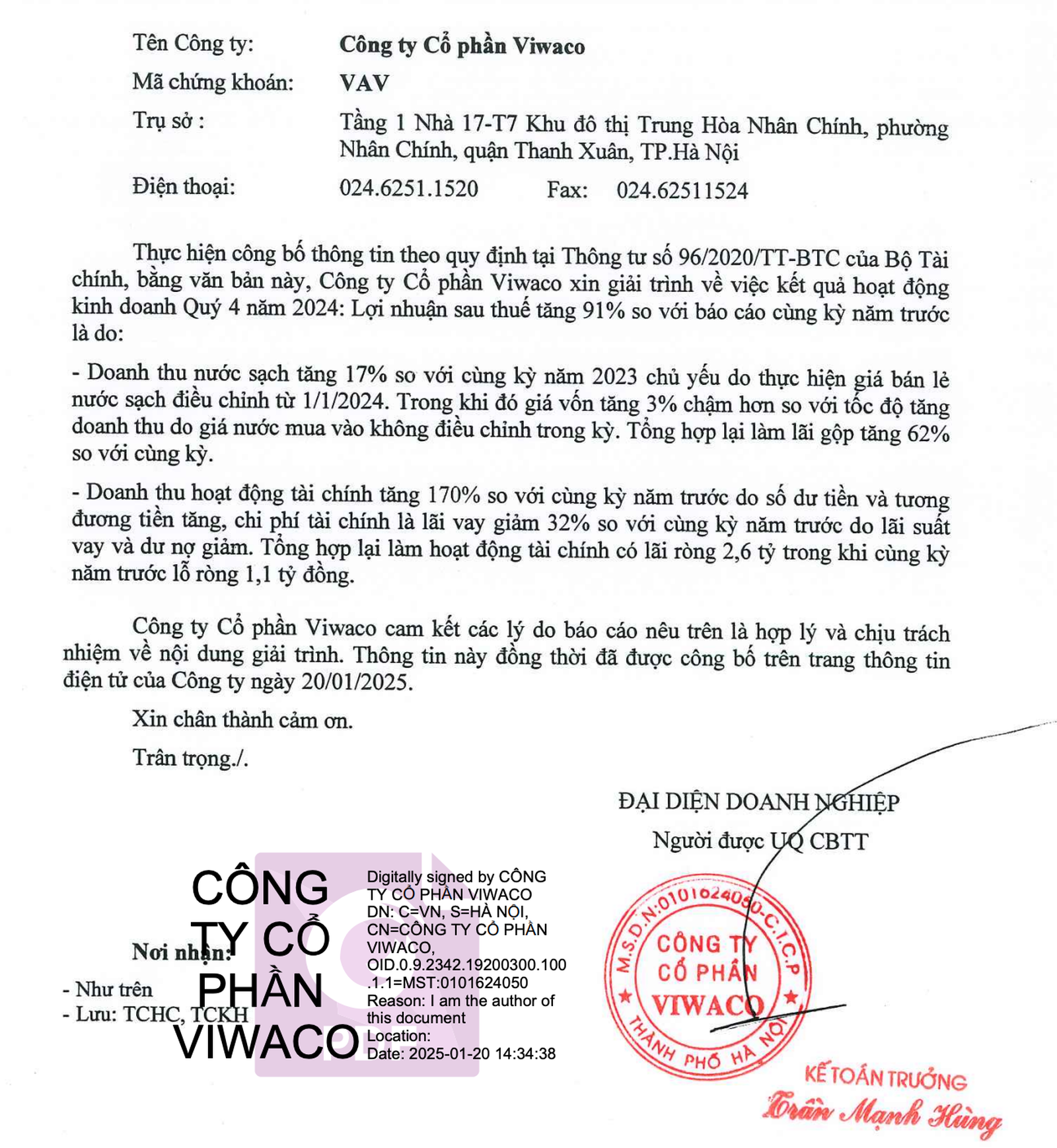 Viwaco đã có giải trình về việc kết quả hoạt động kinh doanh quý 4/2024 với lợi nhuận sau thuế tăng 91% so với báo cáo cùng kỳ năm trước.