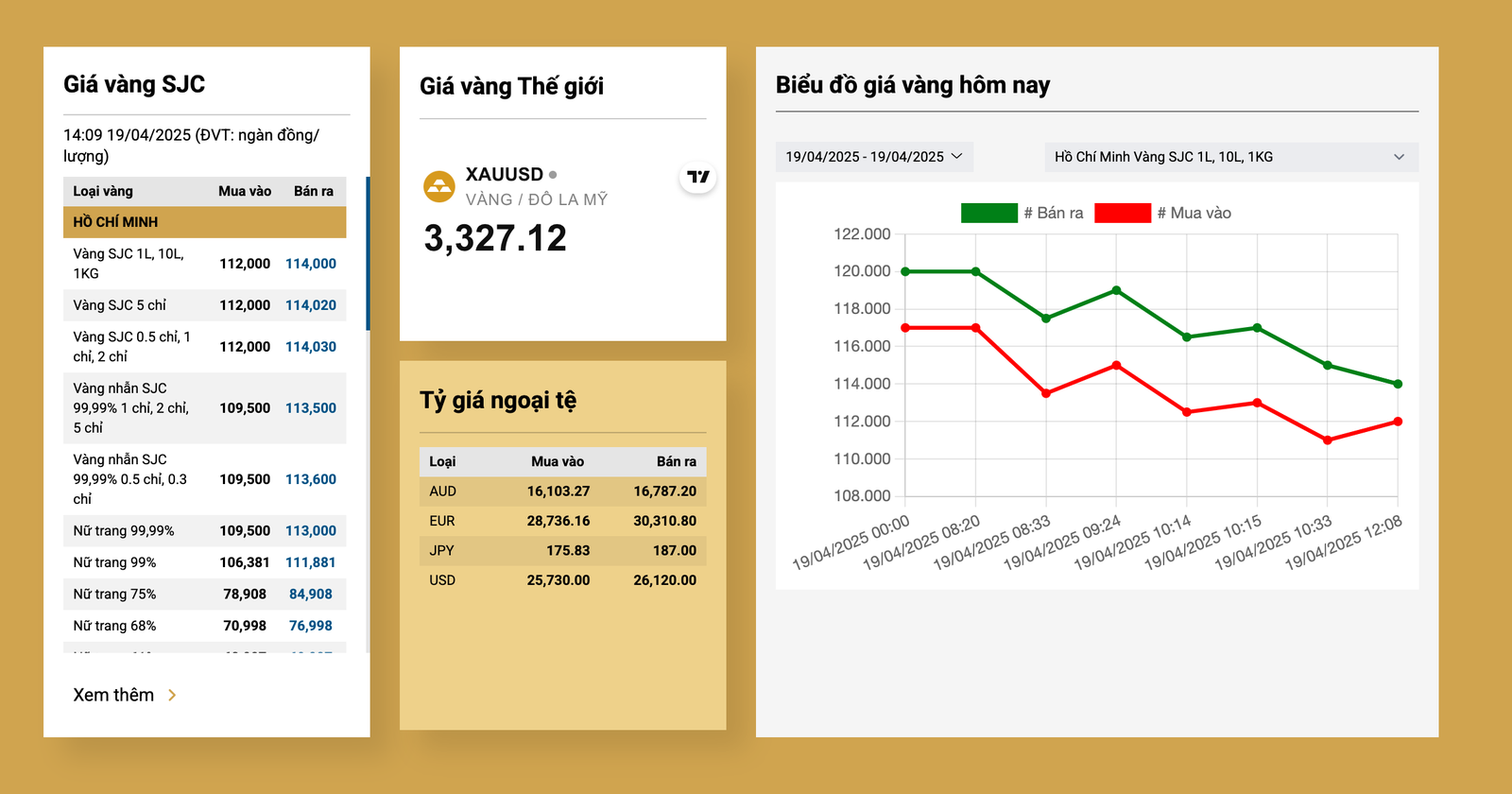 Tính đến chiều 19/4/2025, giá vàng miếng SJC giảm mạnh về ngưỡng 112 - 114 triệu đồng/lượng (mua vào - bán ra). Diễn biến giá vàng đầy kịch tính trong chưa đầy 24 giờ đã khiến không ít người mua lướt sóng rơi vào cảnh “lỗ nặng”. Thị trường vàng đang đứng trước áp lực điều chỉnh mạnh sau chuỗi ngày tăng dựng đứng trước đó.
