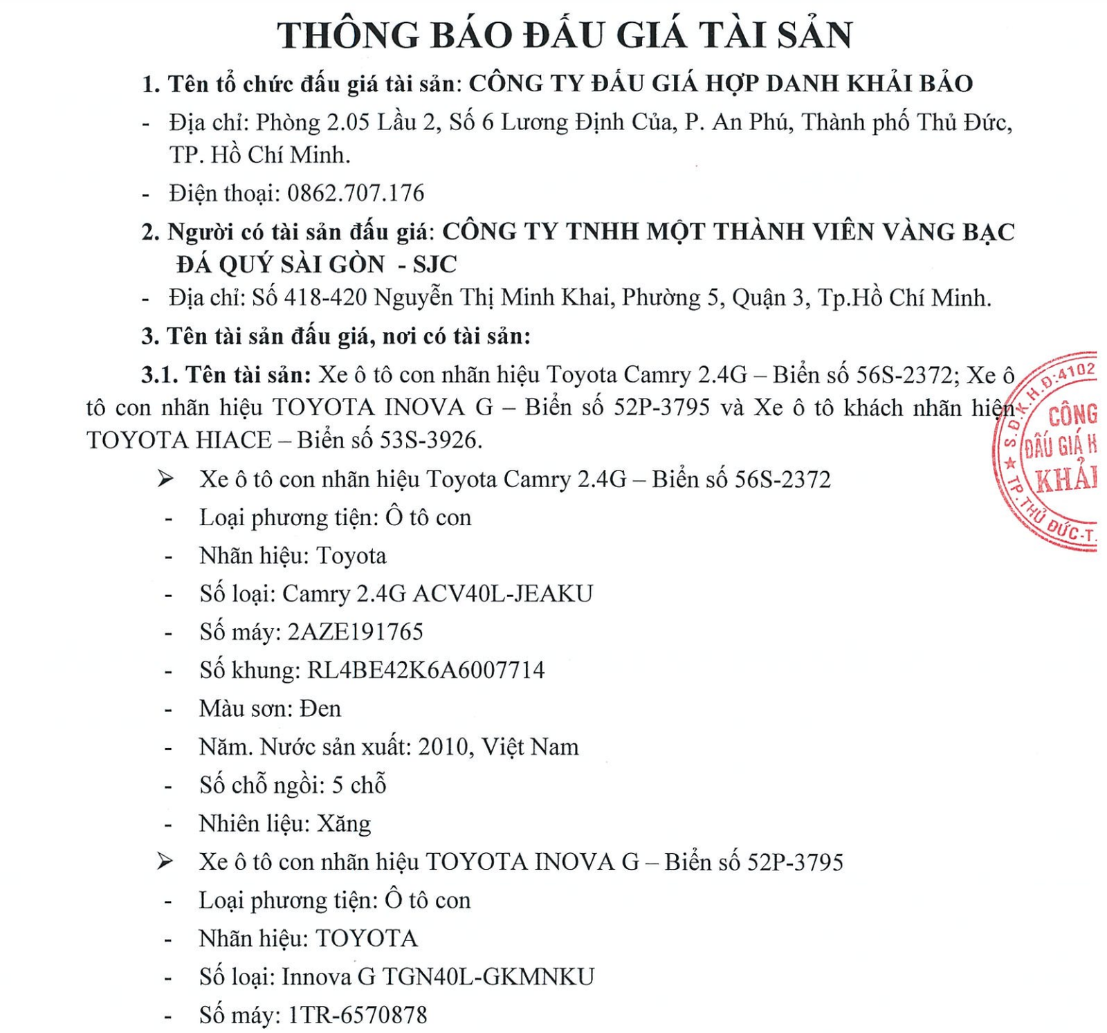 (Thanh tra) - Công ty Đấu giá Hợp danh Khải Bảo (thành phố Thủ Đức, thành phố Hồ Chí Minh) đã có Thông báo đấu giá tài sản loạt xe ô tô nhãn hiệu TOYOTA thuộc sở hữu của Công ty TNHH MTV Vàng bạc Đá quý Sài Gòn – SJC.