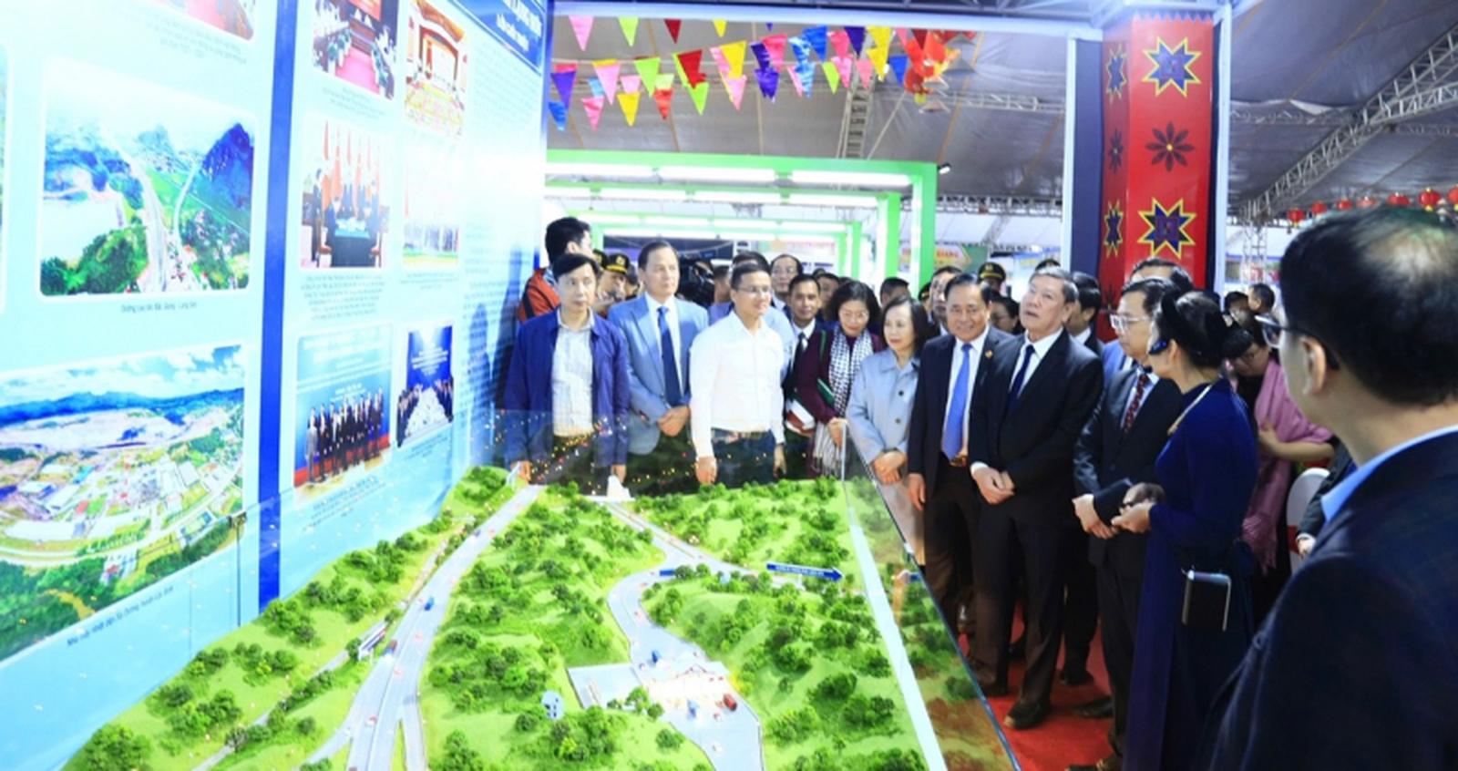 Đồng chí Trần Văn Rón, Ủy viên Trung ương Đảng, Phó Chủ nhiệm Thường trực Uỷ ban Kiểm tra Trung ương, đồng chí Hoàng Văn Nghiệm, Bí thư Tỉnh ủy Lạng Sơn và các đại biểu thăm quan Khu trưng bày, giới thiệu về tình hình phát triển kinh tế - xã hội tỉnh Lạng Sơn.