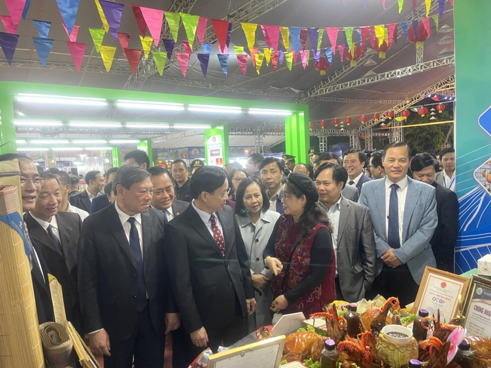 Đồng chí Trần Văn Rón, Hoàng Văn Nghiệm và các đại biểu thăm quan các gian hàng giới thiệu sản phẩm đặc sản của tỉnh Lạng Sơn.