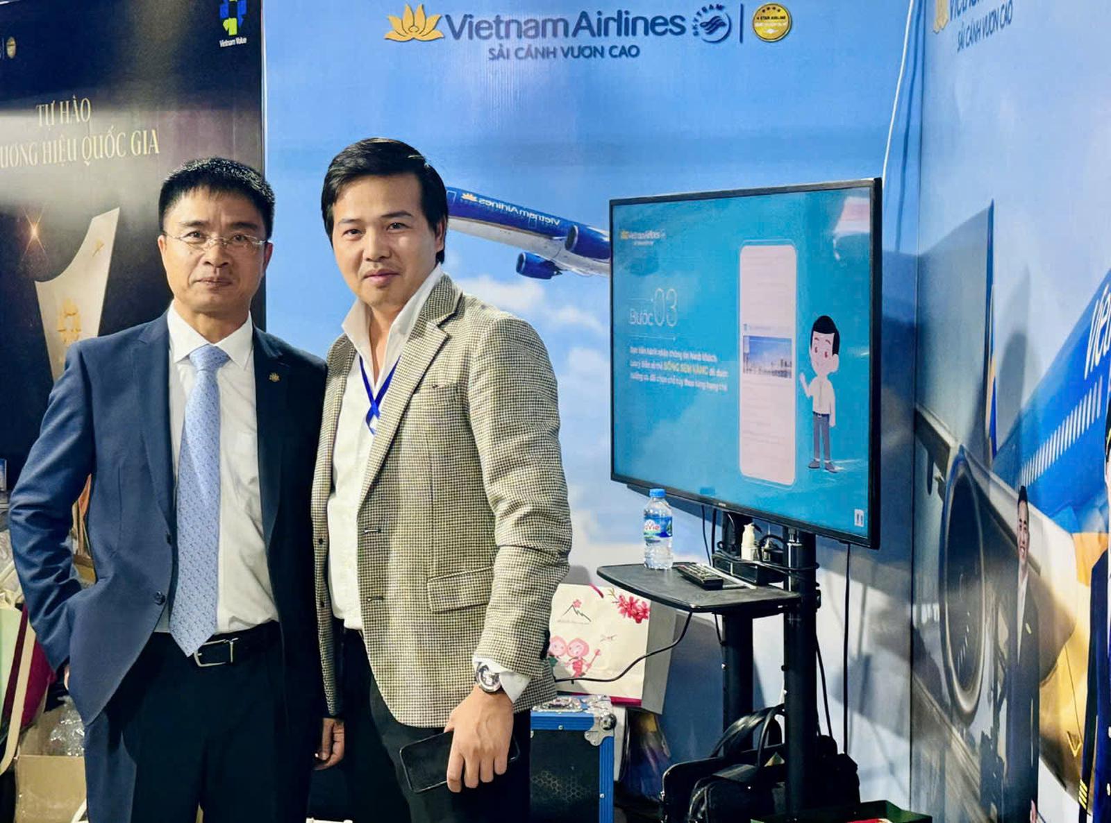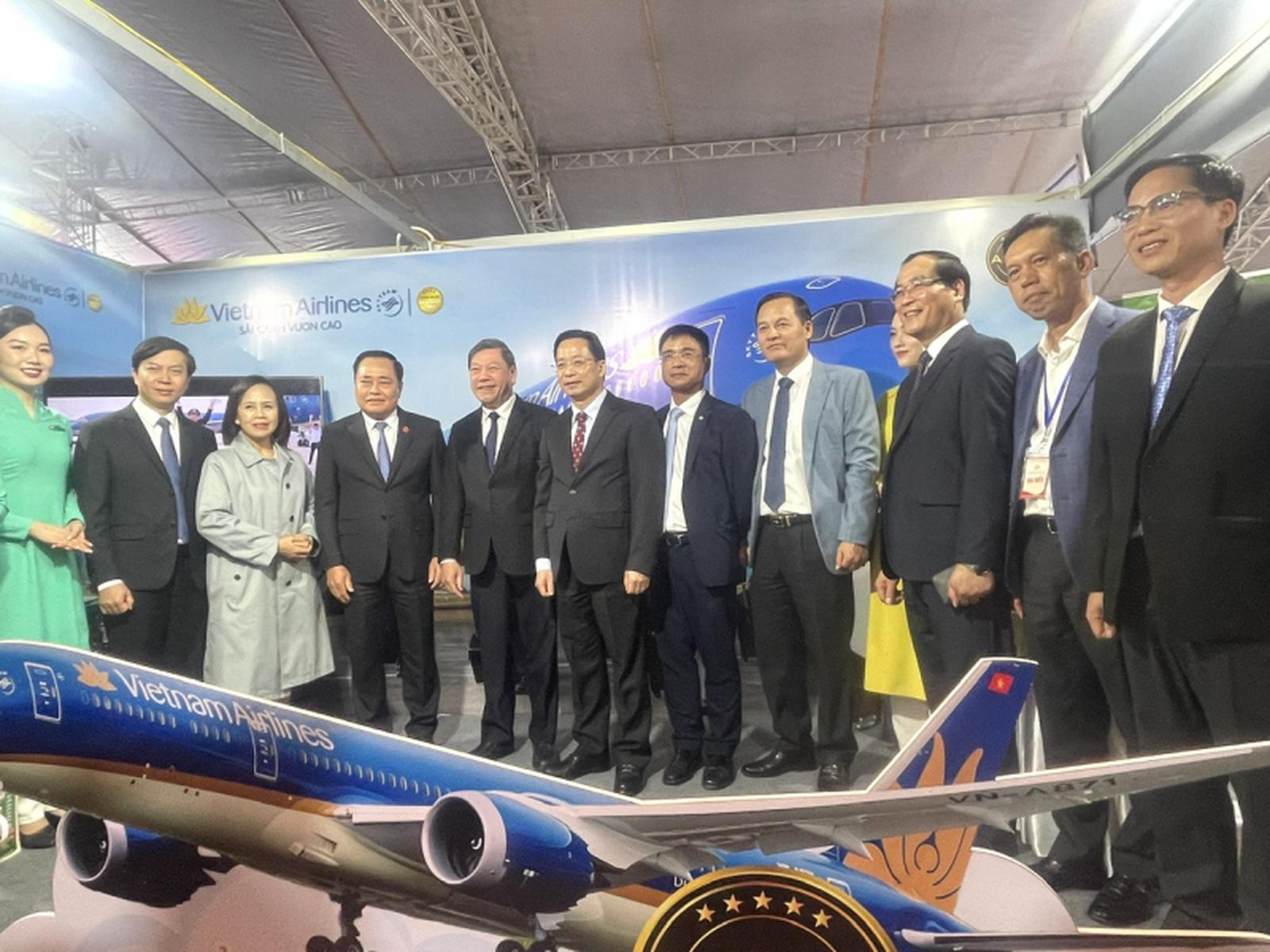 Đồng chí Trần Văn Rón, Hoàng Văn Nghiệm và các đại biểu thăm quan gian hàng trưng bày giới thiệu của Hãng hàng không Vietnam Airlines.