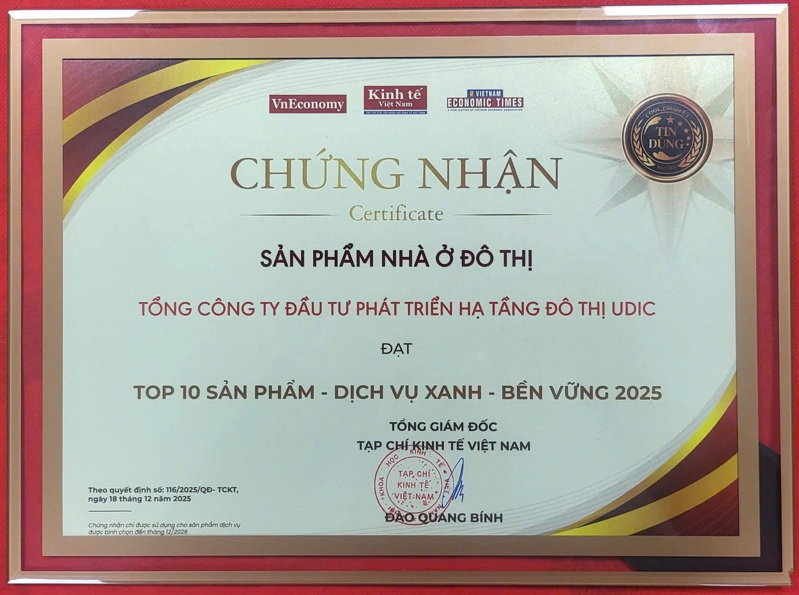 (Thanh tra) - Ngày 18/12/2025 tại Hà Nội, Lễ công bố & vinh danh Sản phẩm - Dịch vụ Tin Dùng Việt Nam 2025 do Tạp chí Kinh tế Việt Nam - VnEconomy đã được tổ chức, Tổng công ty Đầu tư phát triển hạ tầng đô thị UDIC - Công ty TNHH Một thành viên được người tiêu dùng bình chọn và được vinh danh TOP 10 Sản phẩm - Dịch vụ xanh - Bền vững 2025.